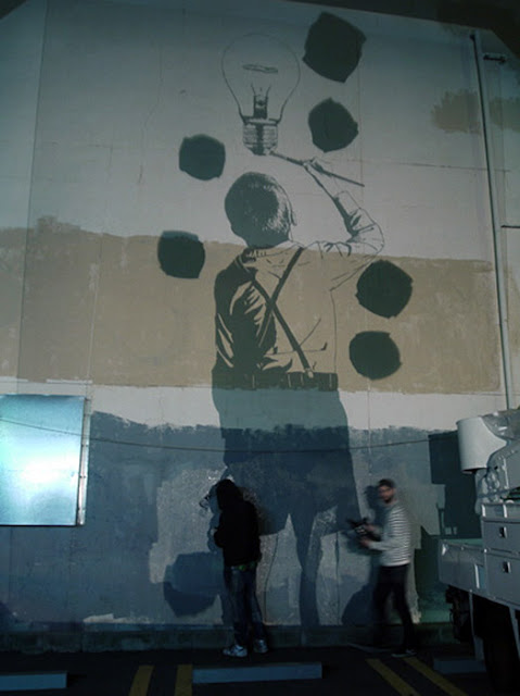 The elusive artist painted this large-scale stencil of young boy painting a light bulb on the streets of Osaka, and if you are in the area, you can check it out on 中央区西心斎橋2-11-18.