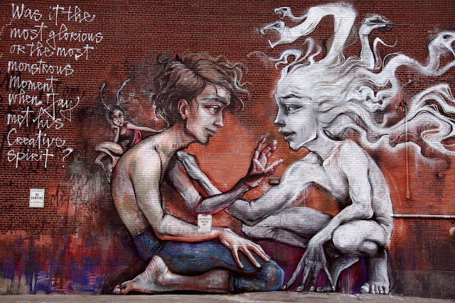 The mural reads “Was it the most glorious or the most monstrous moment when Jay met his Creative Spirit?”