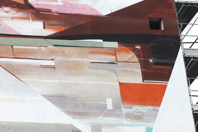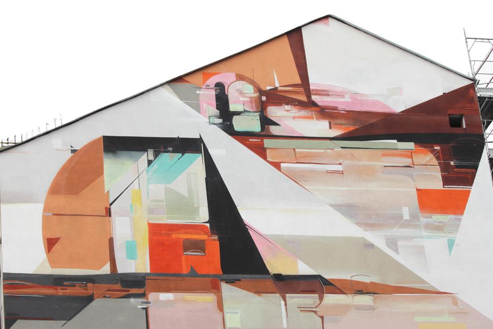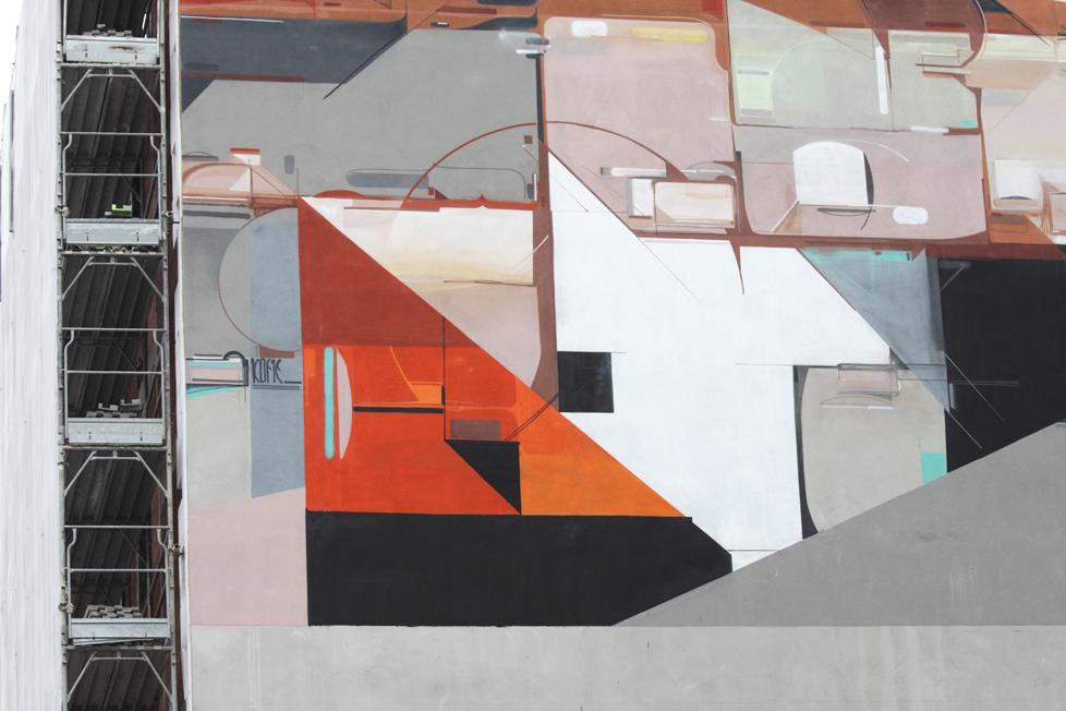 Matching the city’s colour scheme, the mural turns into an abstraction of the surroundings managed and balanced by line, order and form, hence the murals name, “Futurino”.