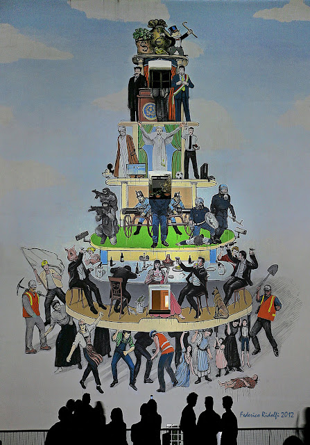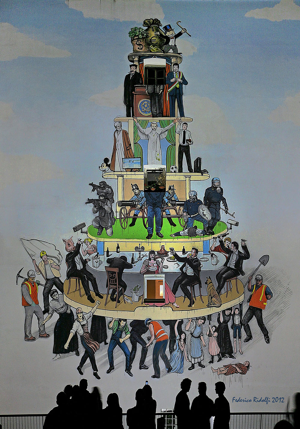 This brilliant new piece depicts a multitude of people being crushed beneath a pyramid topped up by the “God Of Money”. The “In Art We Trust” word critically interrogate the viewer about the possibility to separate the art from its economic value.