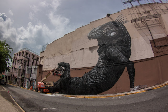 The Belgian artist delivers an epic mural with this massive Iguana holding a Coquí, a small frog native to Puerto Rico.