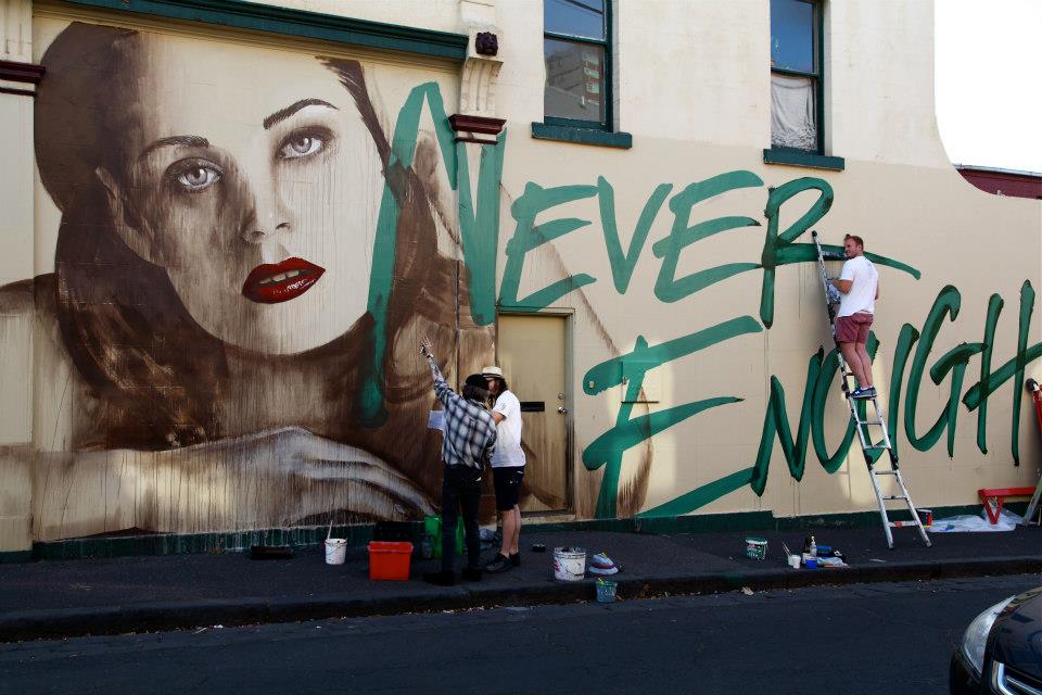 Featuring his signature stylized portraits, this new piece which reads “Never Enough” should be completed in the next few days so check back with us soon for the final pictures.