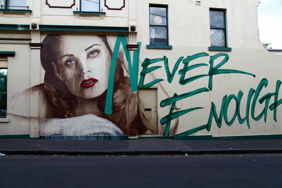 Entitled “Never Enough”, the Australian artist delivers one of his signature portraits combined with text that was painted by Wonderlust.