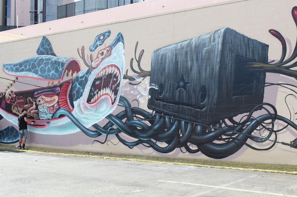 The newly formed duo delivers a massive and stunning piece featuring Nychos’ dissected shark combined with one of Jeff Soto’s signature characters.