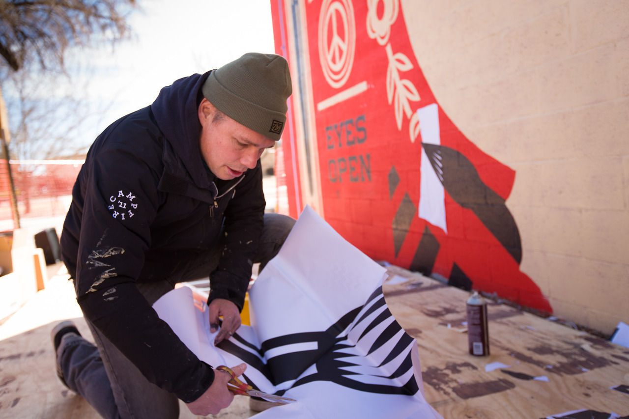 With some help from SFUAD students, the American artist delivers one of his all time classic image “Make Art Not War”.