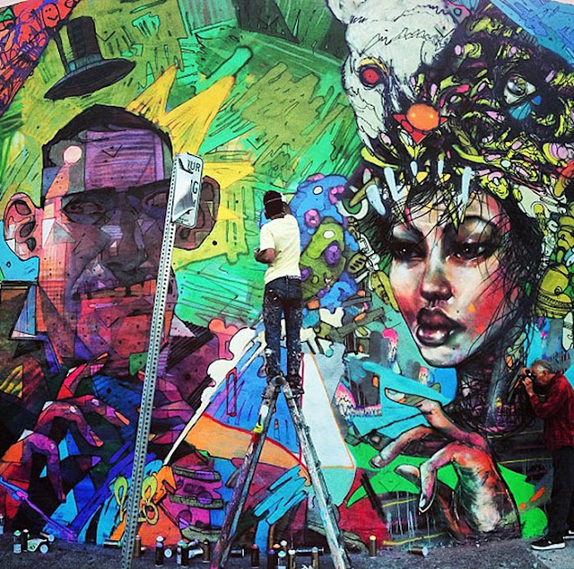 After a massive piece in San Francisco (covered), Aryz is now in Los Angeles where he just completed this collaboration with David Choe.