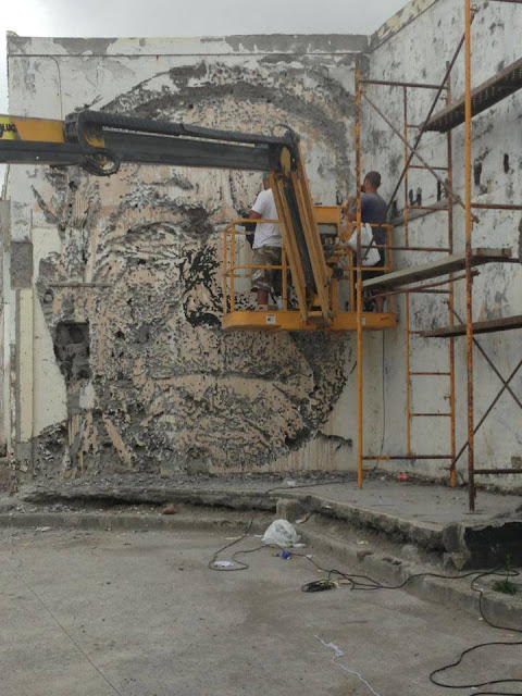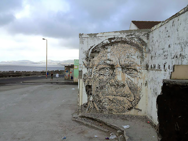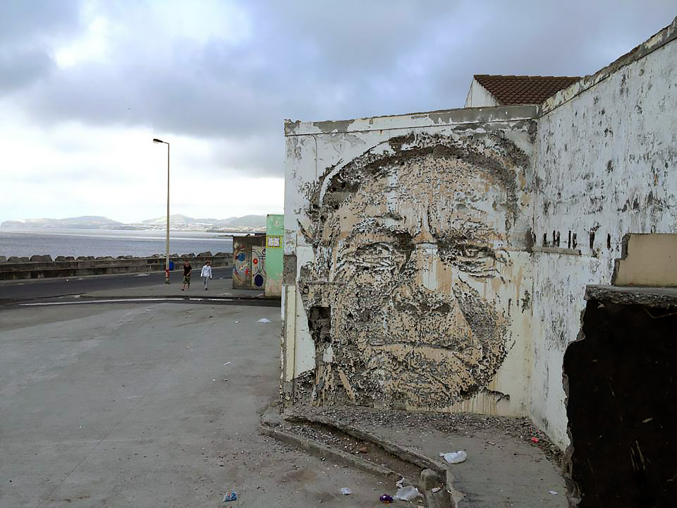 After a quick stop by Philadelphia, USA (covered), Vhils is now back in Europe where he just completed this piece in Ribeira Grande, a city in the northern part of the island of São Miguel in the Portuguese Azores.