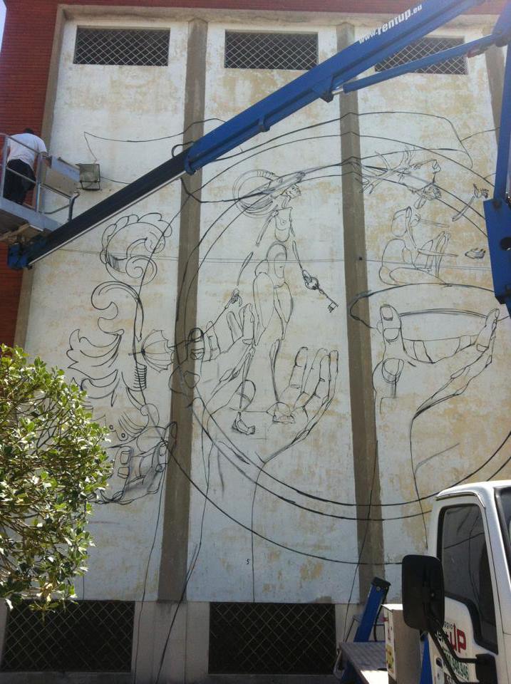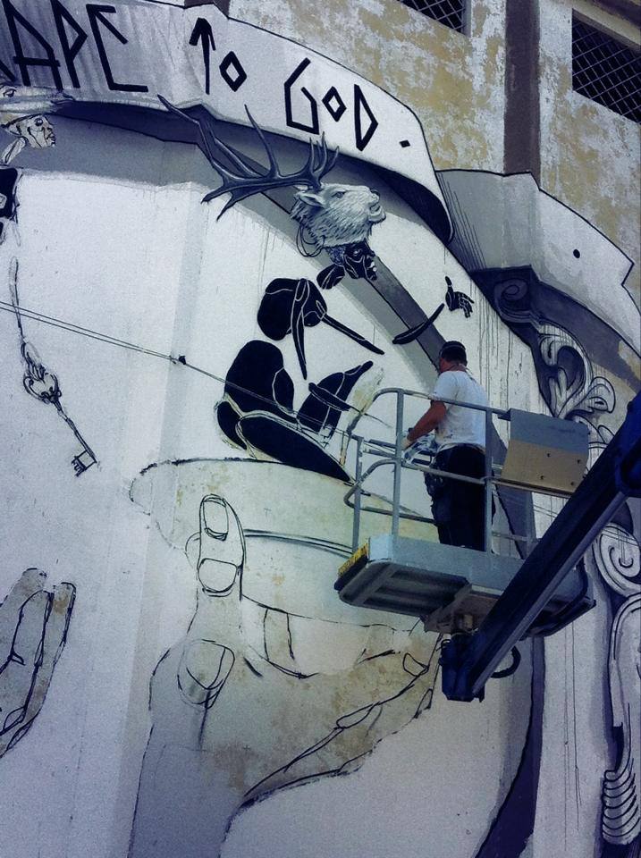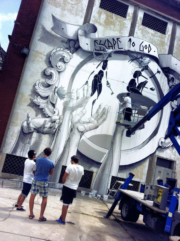 In town for the SketchMate Festival, the German artist painted a beautiful monochromatic piece entitled “Escape To God”.