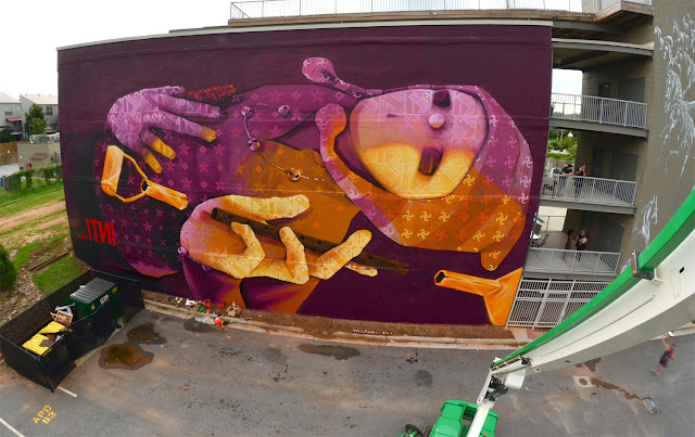 As usual with INTI, this eye-catching mural features bright colours like purple, yellow and red to grab the attention of local pedestrians. The hooded character seen in this artwork is a recurring part of his street pieces.