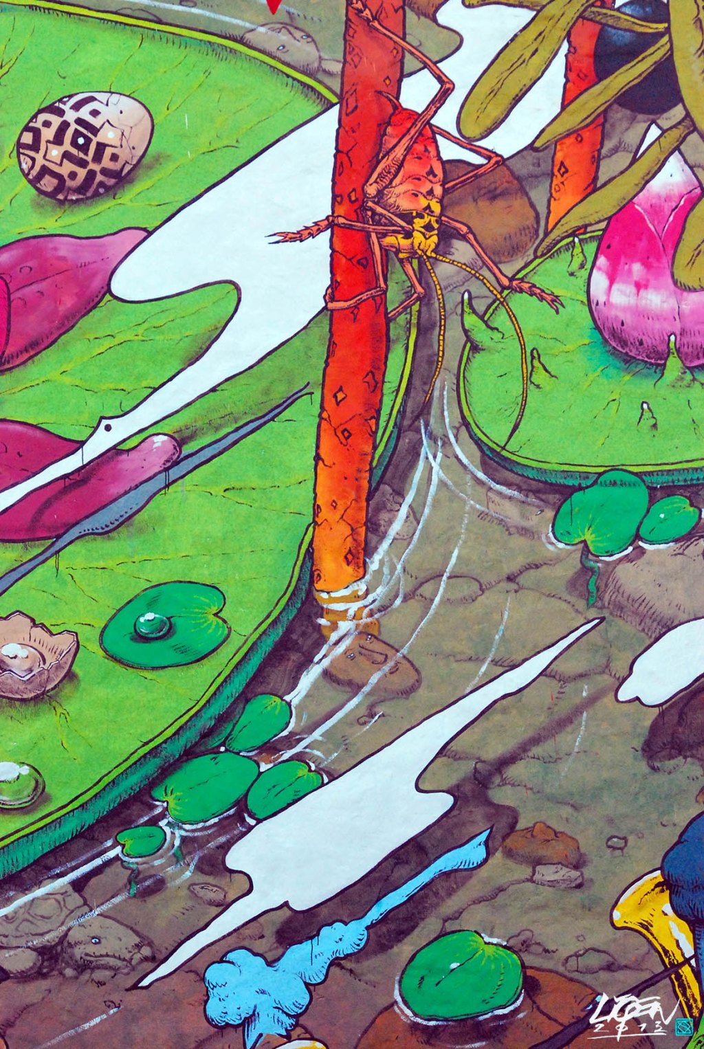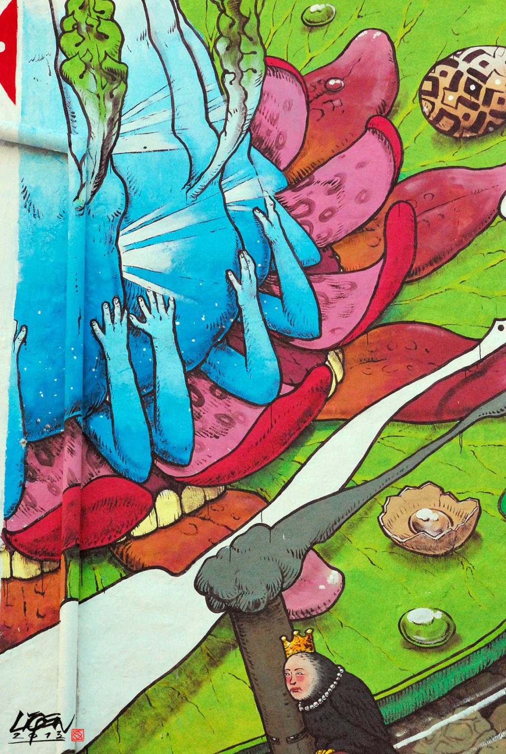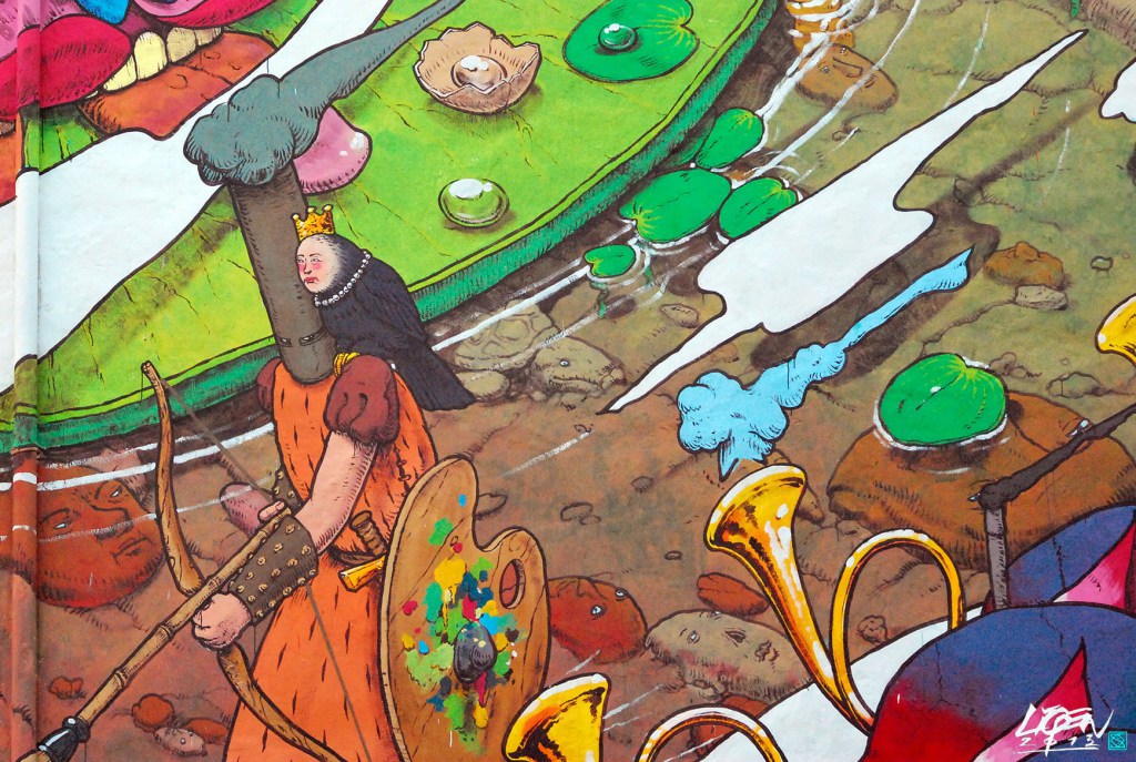 This mural is based on the first dream Liqen has in Croatia and as usual with the artist, it’s a colourful mix of surreal elements and characters. (full dream description below)