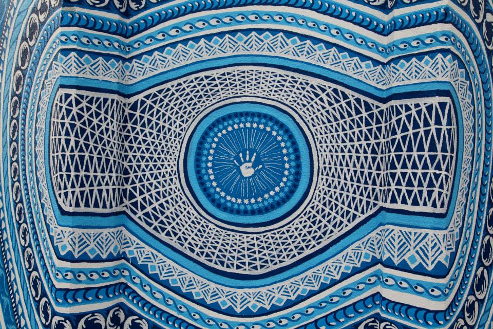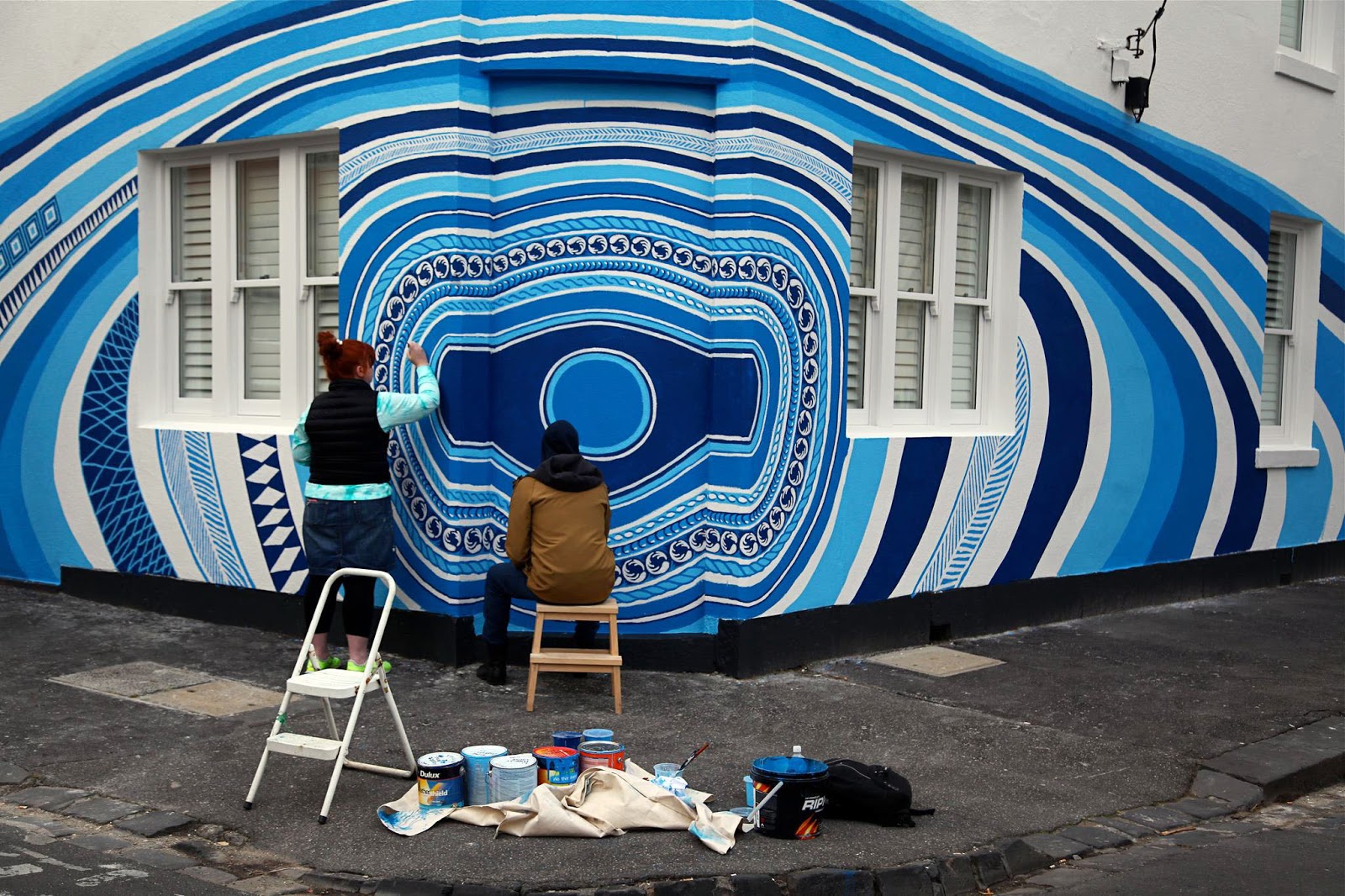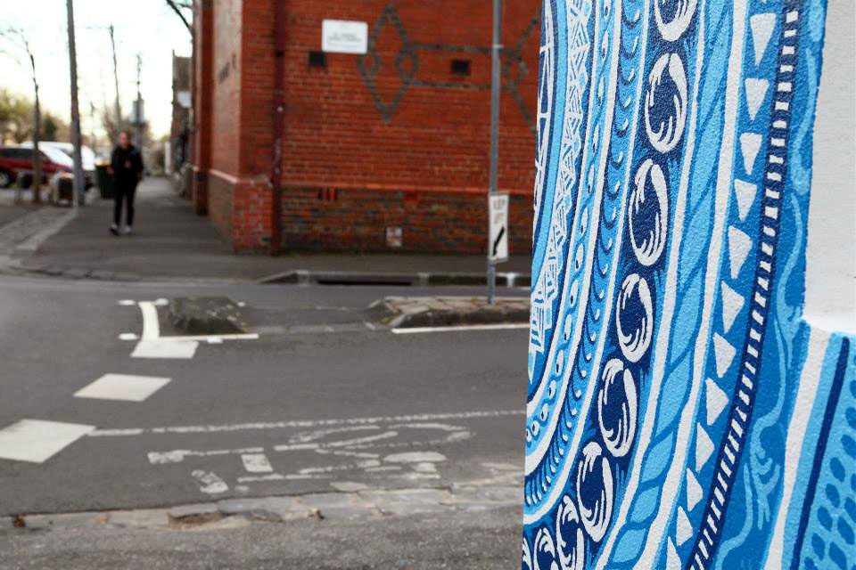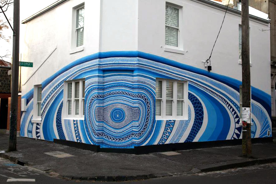 Lucas draws inspiration from a lot of different influences, his intricate geometric line-work often references islamic motifs and patterns, however what is probably most recognisable to Australian audiences is his appropriation of traditional Aboriginal painting in some works.