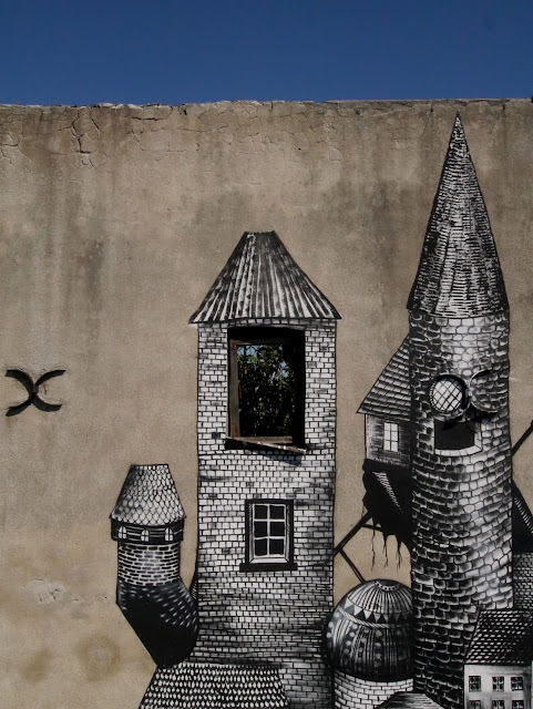 The globe-trotting street artist painted a huge floating castle but a closer look reveals some of his signature characters at work.
