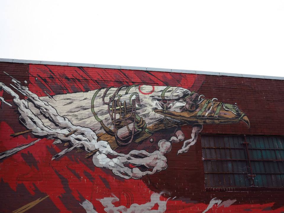 On the left side, an eagle reaches its claws out toward a big apple. On the other side, a creature wearing different masks slowly moves toward the apple. This mural is meant to show the struggles of people of different backgrounds to make it to NYC.