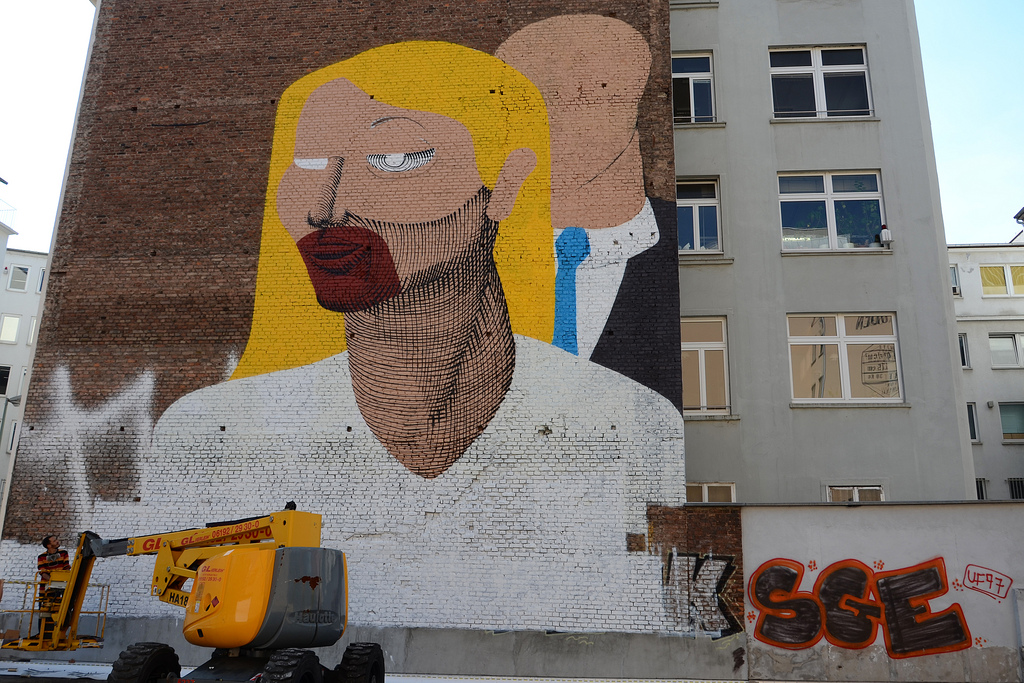 Nunca’s frank and figurative street work is characterised by a bright spectrum of colours and his use of hatching lines to give the forms volume and definition. Traditionally seen in old prints like etchings and woodcuts, the street artist resourcefully uses this technique to cover large surfaces with lines