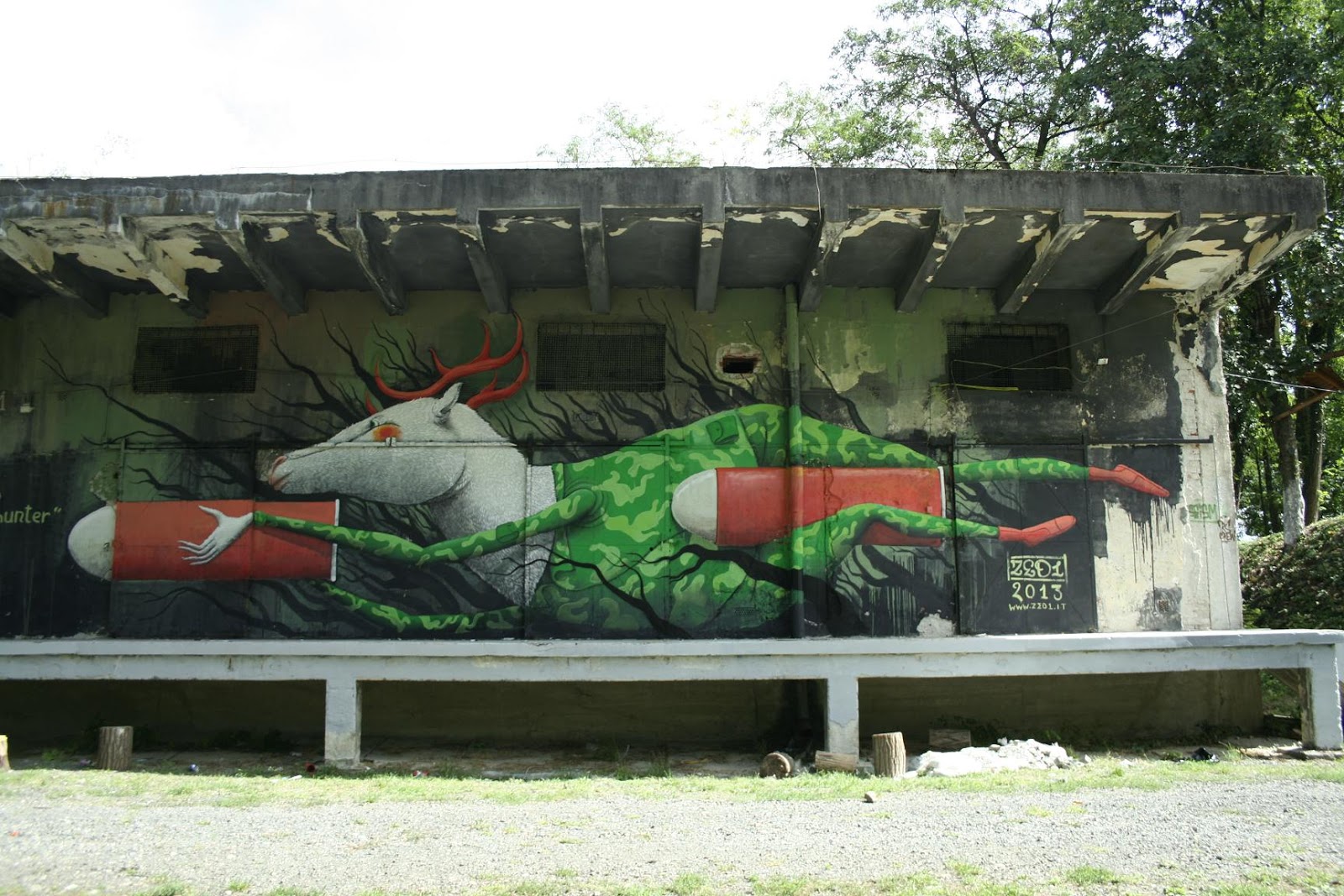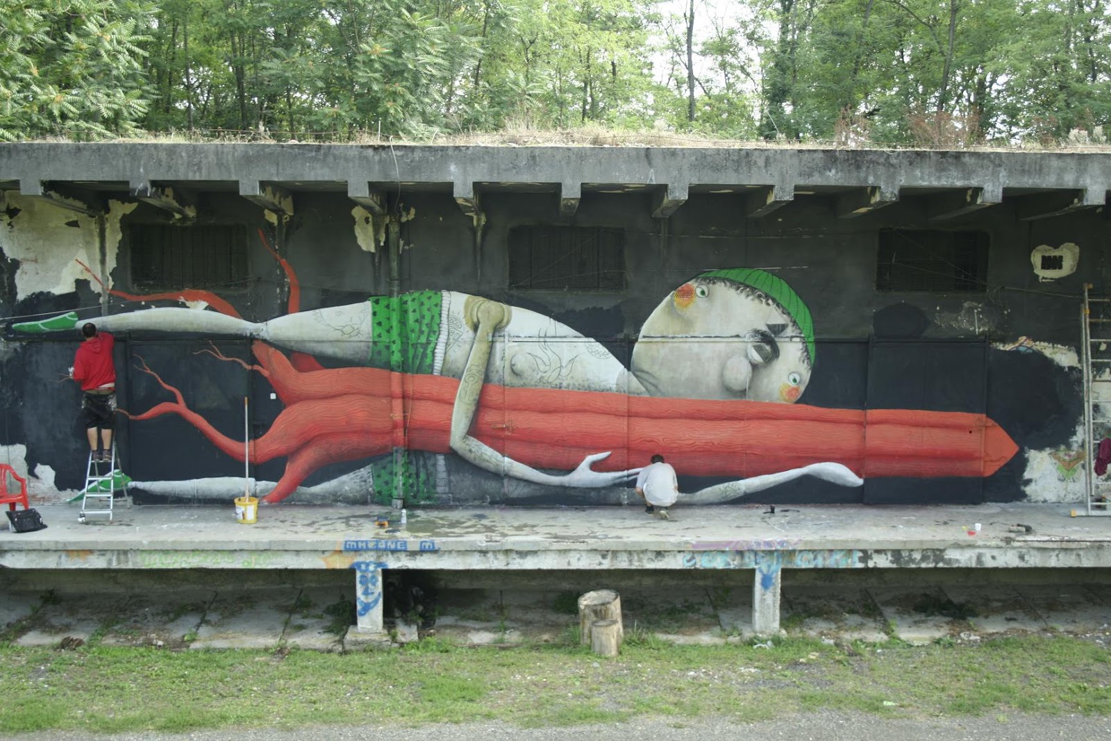 The Italian street artist wanted to work on something inspired by things that happened in Romania. The idea behind this piece is the impact caused on wildlife by the deforestation of local woods. The stag is fighting the man that takes down the trees.