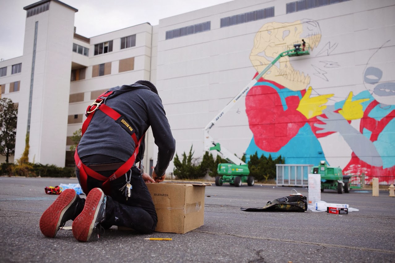 The first completed piece is a rad collaboration between Jasper Wong and Kelly Towles depicting a dinosaur and a bandit playing cat’s cradle, a classic children’s string based gamed.