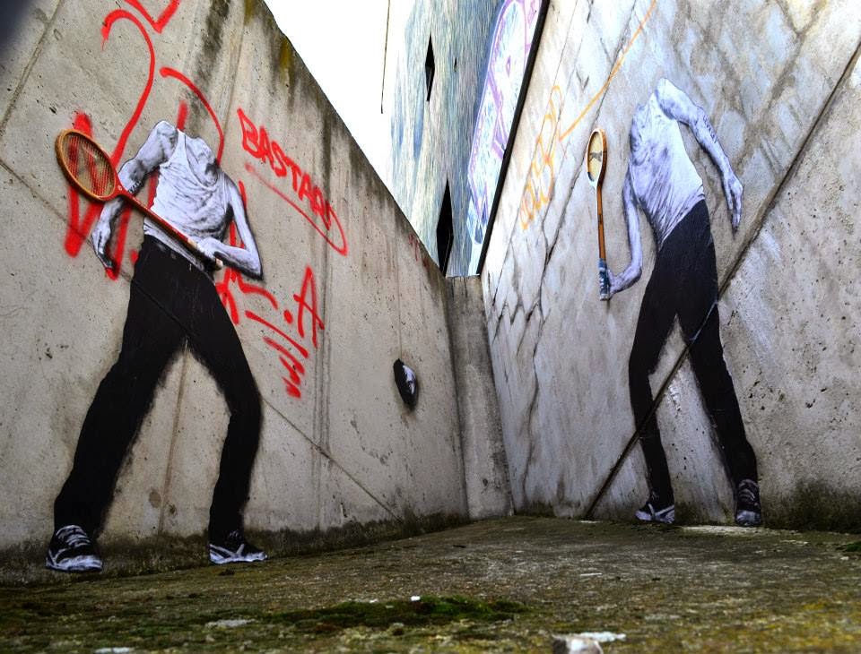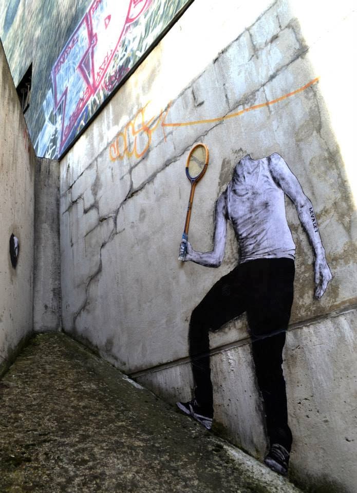 Entitled “Jouer Sa Tete” (Playing its head), the French artist incorporated tennis racquets with his signature life size pasters.