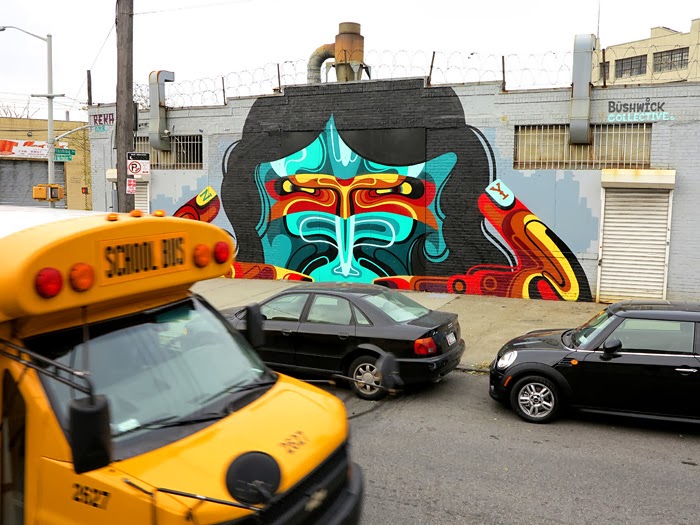 Working for two days on the corner of Flushing ave and St.Nicholas ave, the Australian street artist branched away from his sensual feminine imagery to paint this colourful and angry-looking portrait.