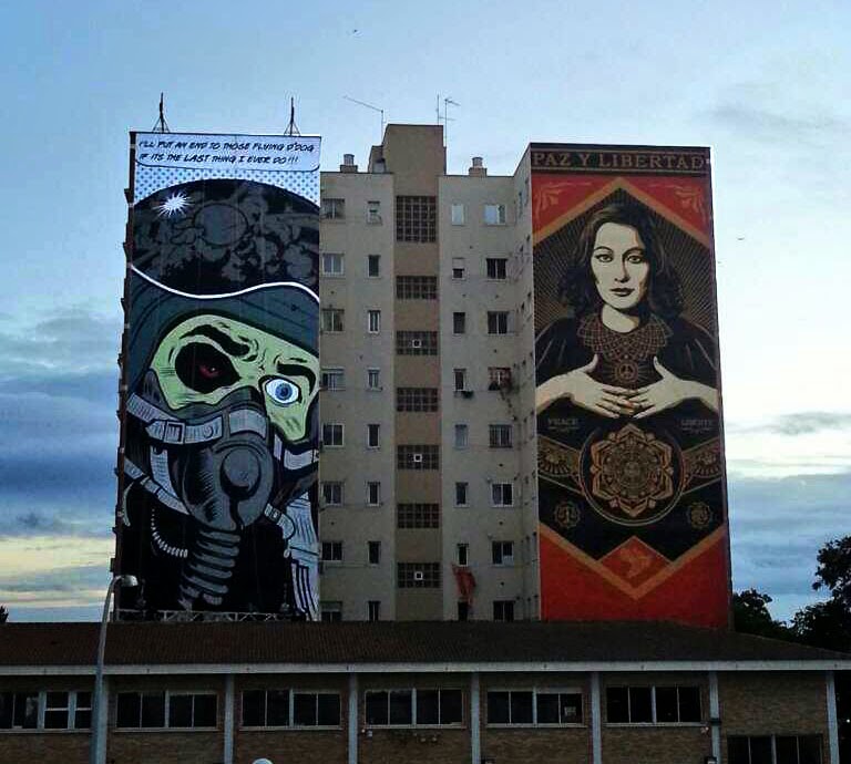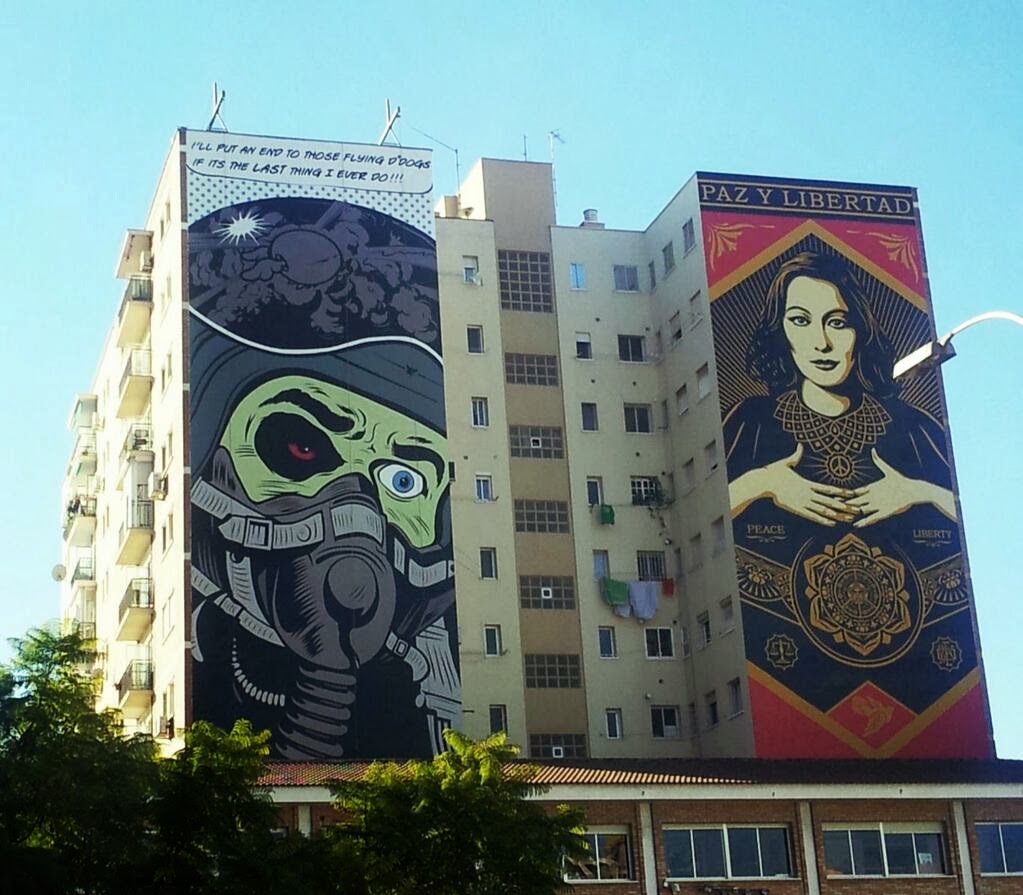 Invited by the excellent Maus Malaga Festival, the popular British Street Artist and his crew quickly painted this signature piece which reads “I’ll put an end to those flying D*Dogs if its the last thing i ever do”. If you stop by Malaga soon, the mural can be seen on the facade of the Colegio García Lorca.