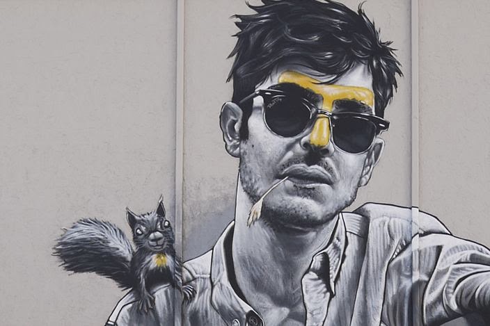The mural features a hyperreal portrait of a man reading “The Society of the Spectacle” by Guy Debord and the letter “T” painted on his forehead. The title of the piece is “Florida, Mon Amour…” (Florida, My Love…). This mural was organised by “Going Vertical” and curated by Kafi Benz.