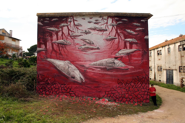 This new mural which is entitled “AP 16.3” (a biblical reference), has to do with the heavy pollution found in many rivers in Portugal. According to the artist, it’s also linked to his feeling of being Portuguese. The link between sea and water. A famous Portuguese quote says: “Oh salty sea, how much of your salt is tears from Portugal”.