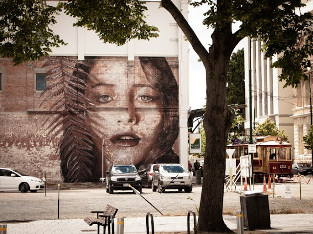 In town for the Rise Street Art Festival, the Australian artist painted this beautiful portrait of his model Teresa Oman combined with a Silver Fern motif (which is associated with New Zealand).