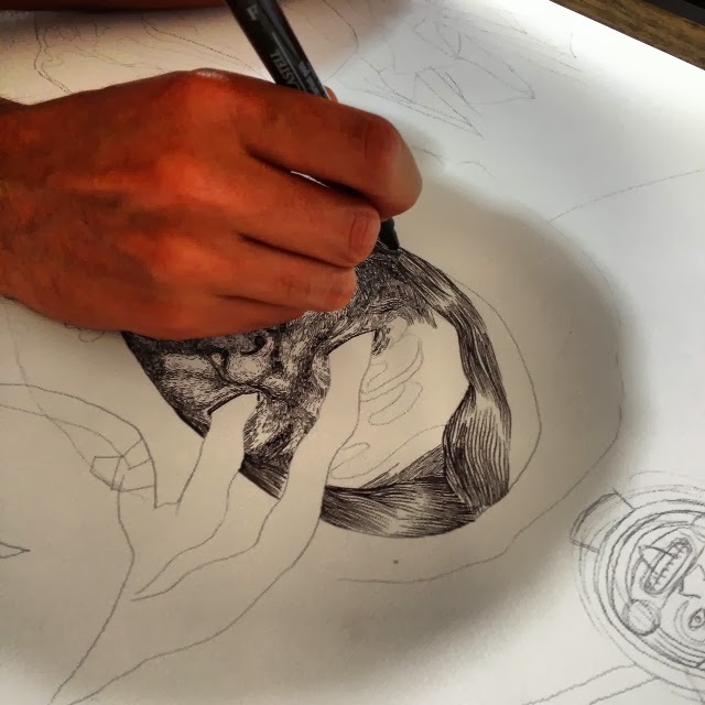 During a short but fruitful stay in Mexico during October 2013 my intention was to create a work made entirely in that country. The main idea was to build on what I feel and understand from the Mexican mythological history and social events, two factors that are constantly present in my work ( metaphysical, human and social realities ) . The prints are achieved through a plastic exercise called “situationism” (one of the main driving currents of social events in France in May 1968 ).