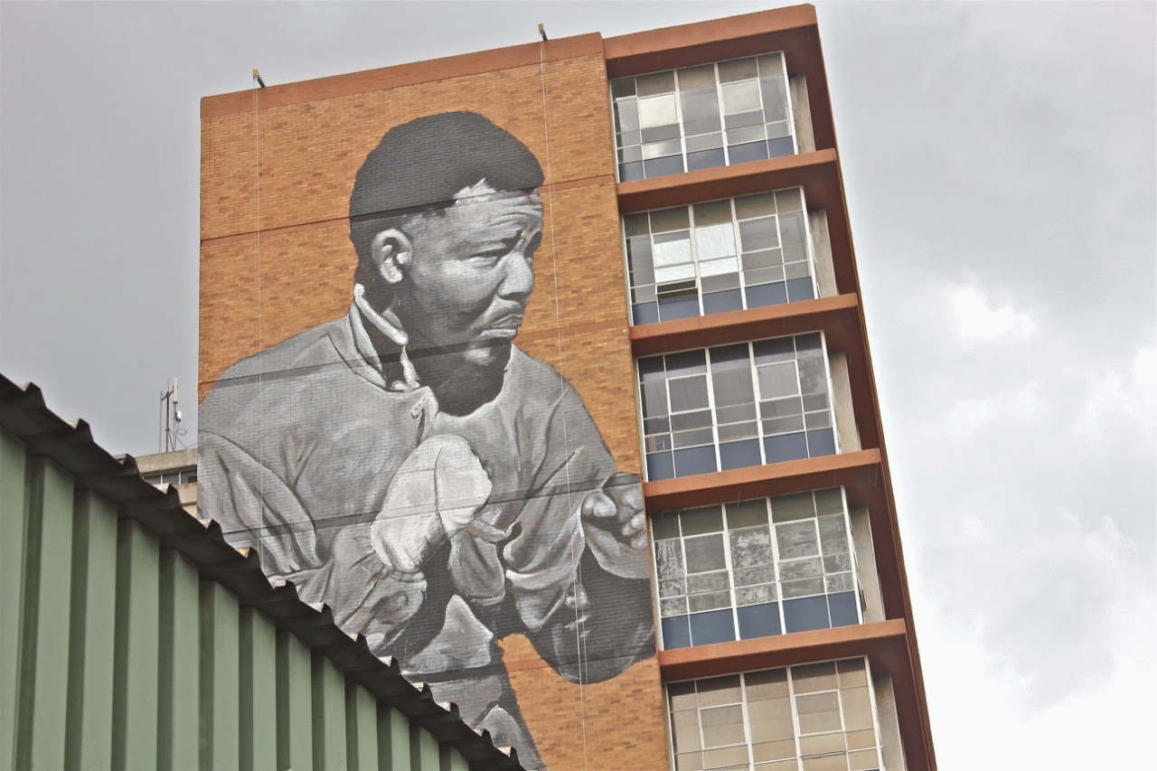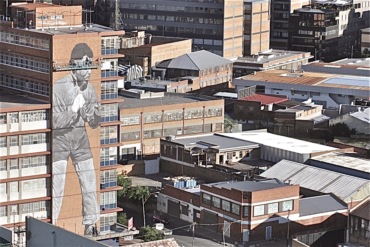 Freddy Sam was recently invited to paint a 40 Meter tall Nelson Mandela mural in the east city of Johannesburg commissioned by the Maboneng precinct as a gift to the city in memory of this giant of a man. The mural is inspired by Madiba’s definition of ‘Ubuntu’ which is: ‘You cannot be human all by yourself’.