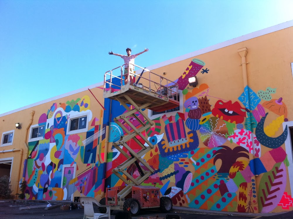Titled Coconut Sunrise, El carnaval de la juventud and Acid Galaxy, these colorful murals are awesome mixture of their distinctive vivid styles – Mina’s colorful shapes, Zosen’s naive illustrative style, and Kenor’s heavily geometrical abstract images.