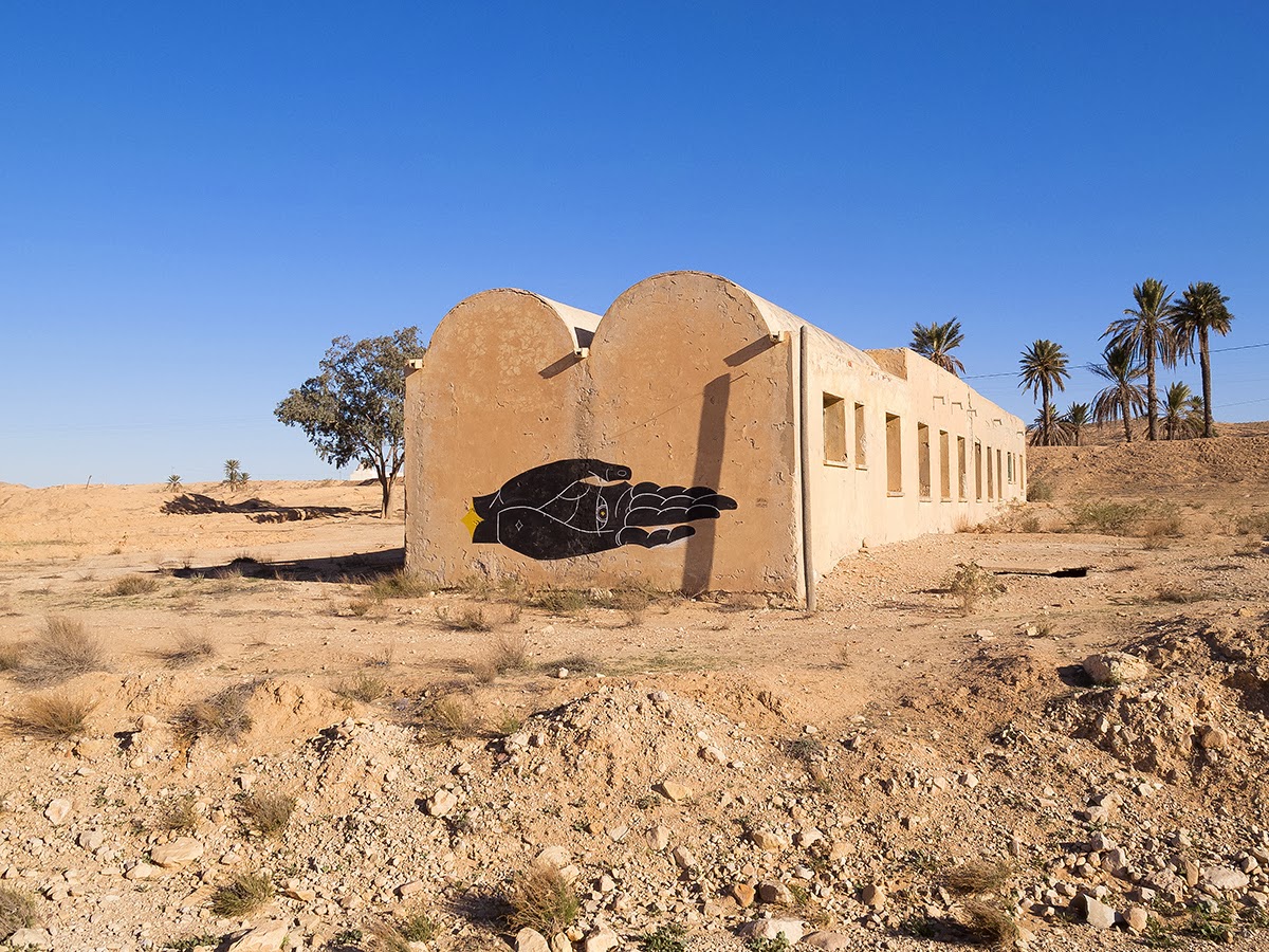 The Italian artist made this piece in the middle of the Tunisian desert, near the old troglodyte town of Matmata. Luckily, he found a rather nice abandoned building along the way and stopped to paint its walls.