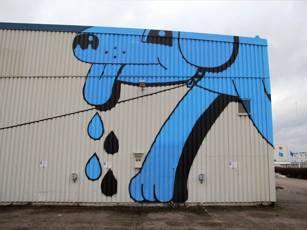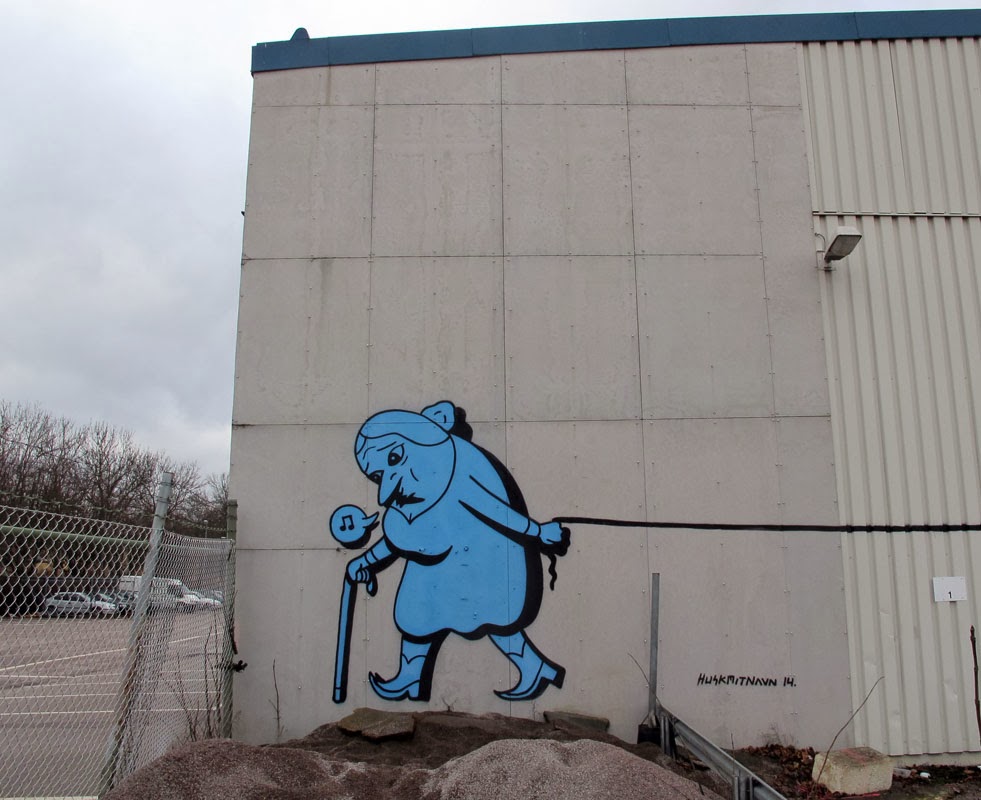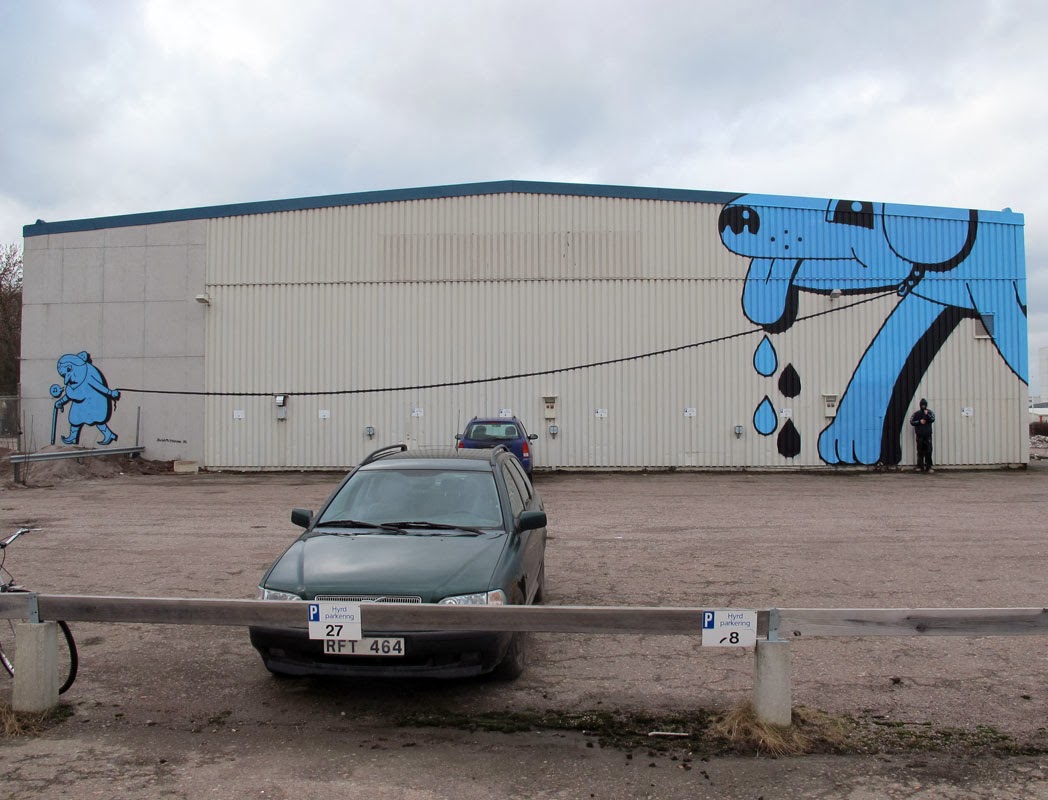 Danish artist HuskMitNavn recently visited Sweden where he created this large mural in Linköping. Known for his clean, cartoon like style, and his witty images, this piece is showing an elderly lady walking a giant dog. Cleverly using up a given surface, and with minimalist color palette, this simple piece is a classic example of his work. This mural was created as an intro for his upcoming solo show opening @ Passagen Linköpings konsthall in Linköping on March 29th.