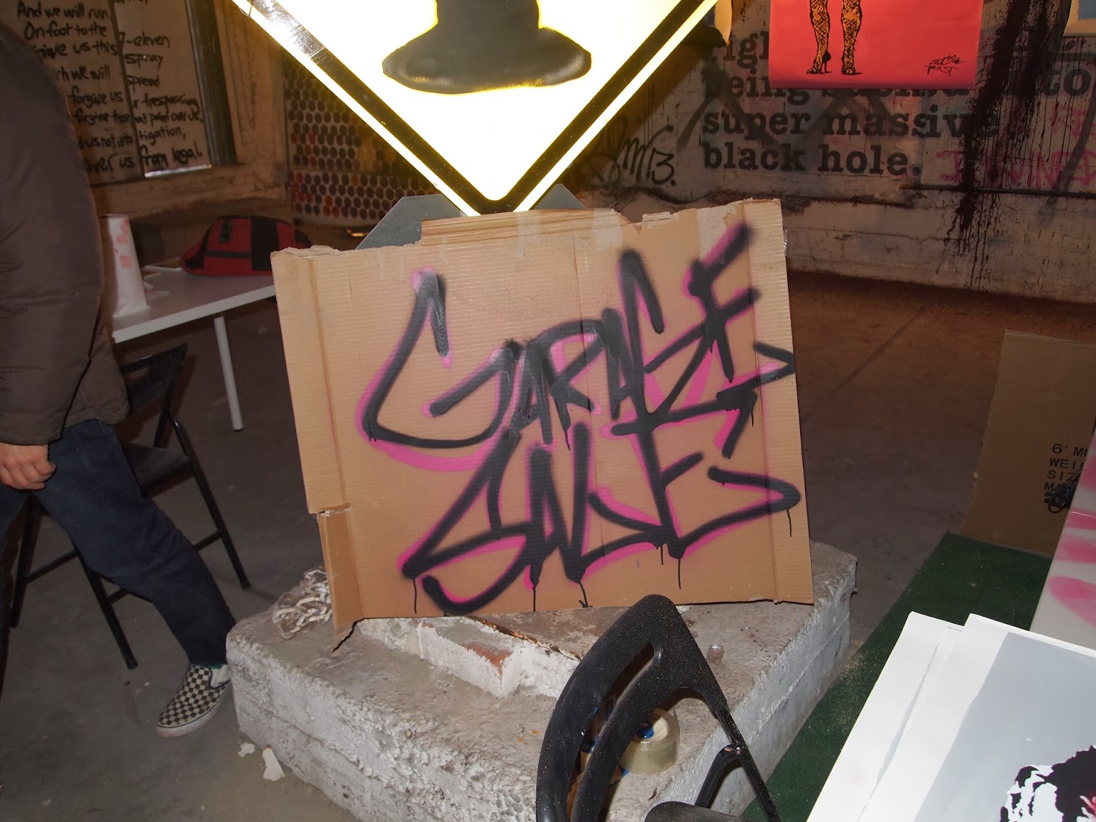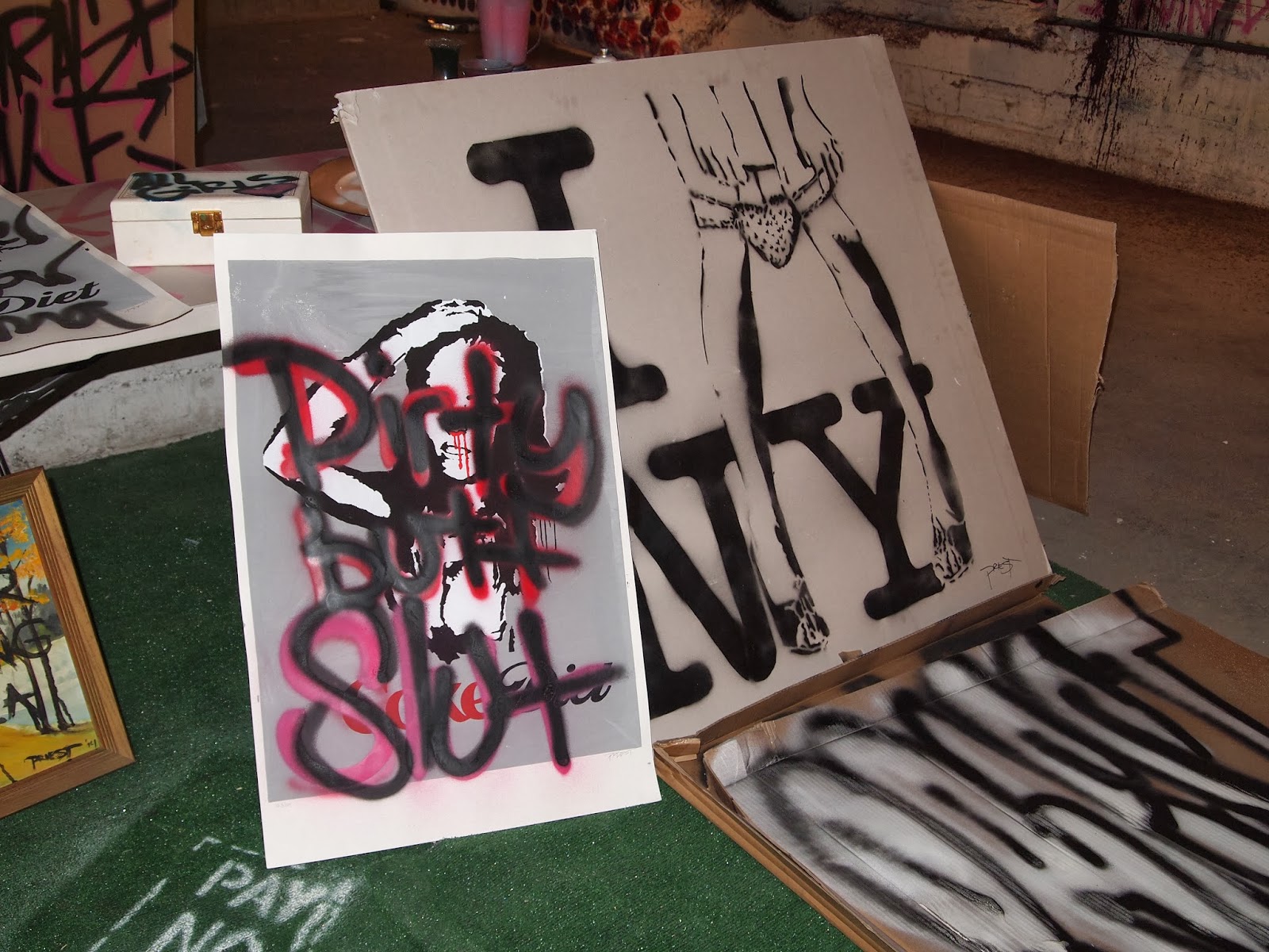 Priest does not stop at traditional paint on canvas, but additionally included an installation entitled “Dumpster Diver” which combines a stencil of a diver image above a pile of NYC garbage below.