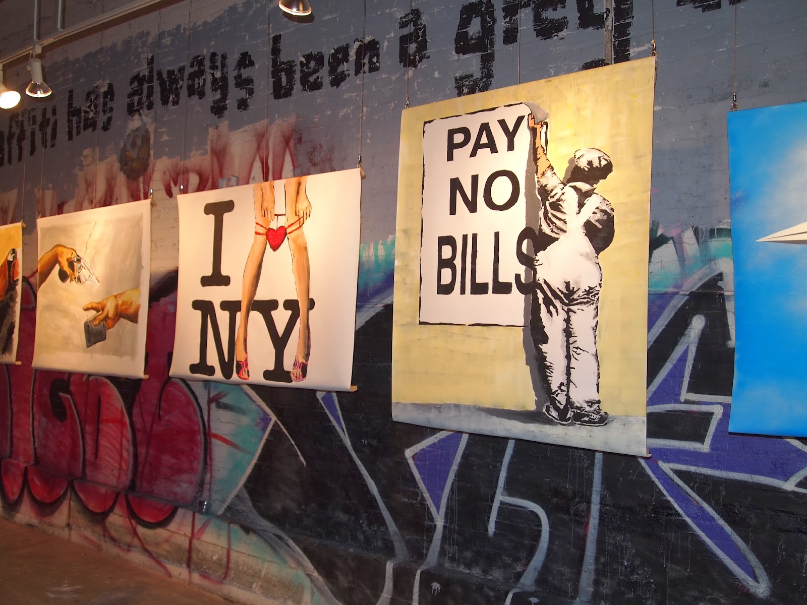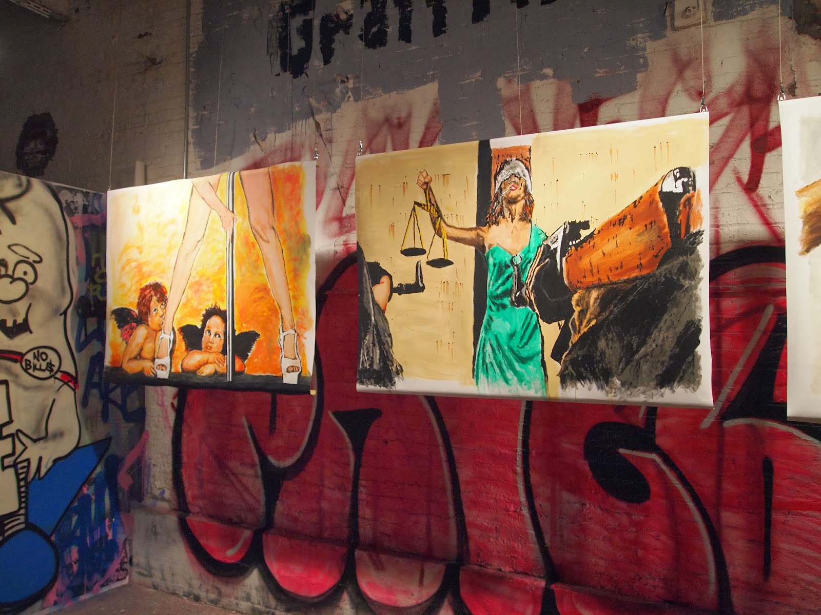 Priest’s works presented mostly include large format paintings on canvas combining a dry whit that plays off classic American stereotypes. Noteworthy pieces include the classic “I Heart NY” logo replacing the heart with a women dropping her panties, and the classic cherub babies enjoying a night at the gentlemens club.