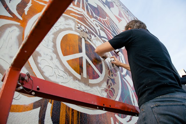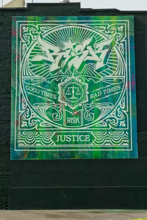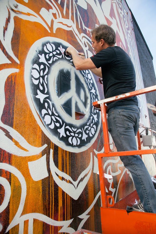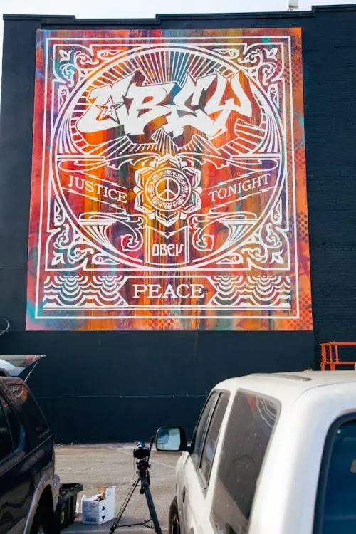 This mural builds upon the approach RISK and Shepard Fairey took for the Peace & Justice mural they did in Miami, but pushes the collaborative process further. This time RISK painted the backgrounds and Shepard Fairey painted the foreground however, they collaborated on the foreground imagery and concept.