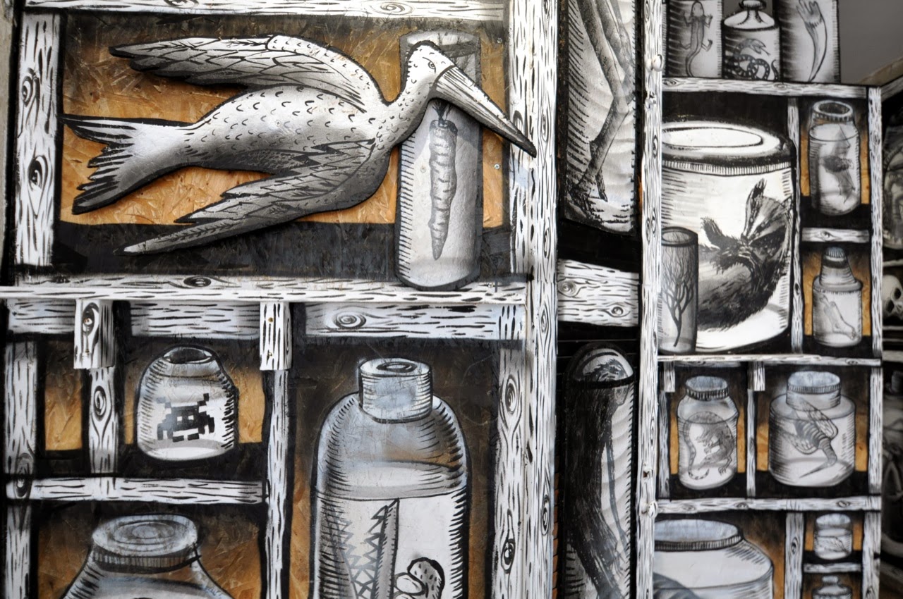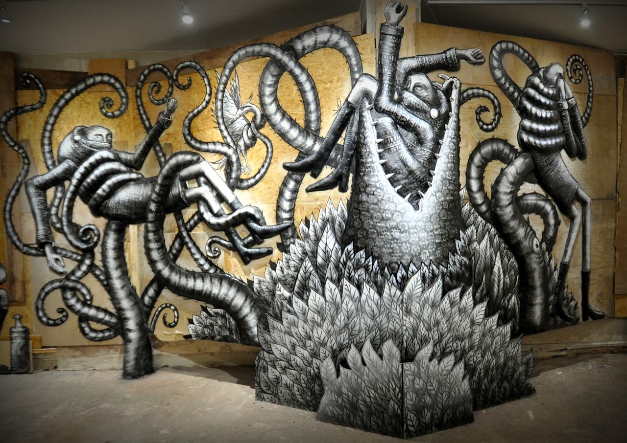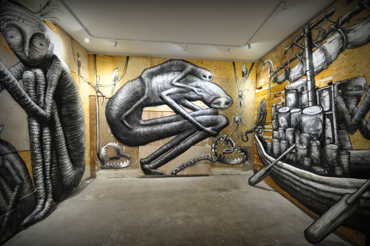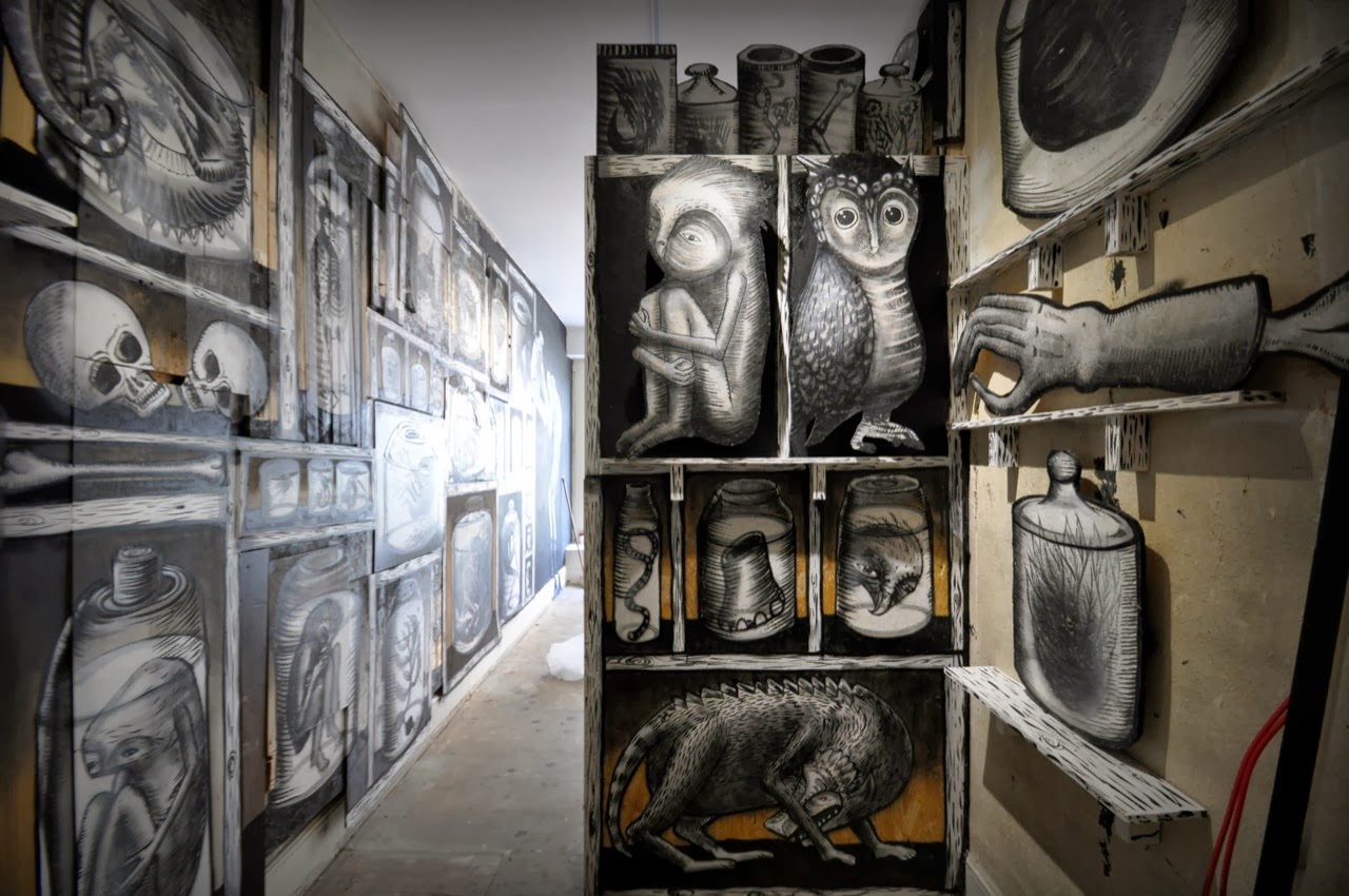 The show starts with a small maze showing a bunch of painted specimen jars containing animals and various nods to other artists like Banksy. The next part is a large room with a series of massive monochrome characters painted in plaster relief upon the walls.