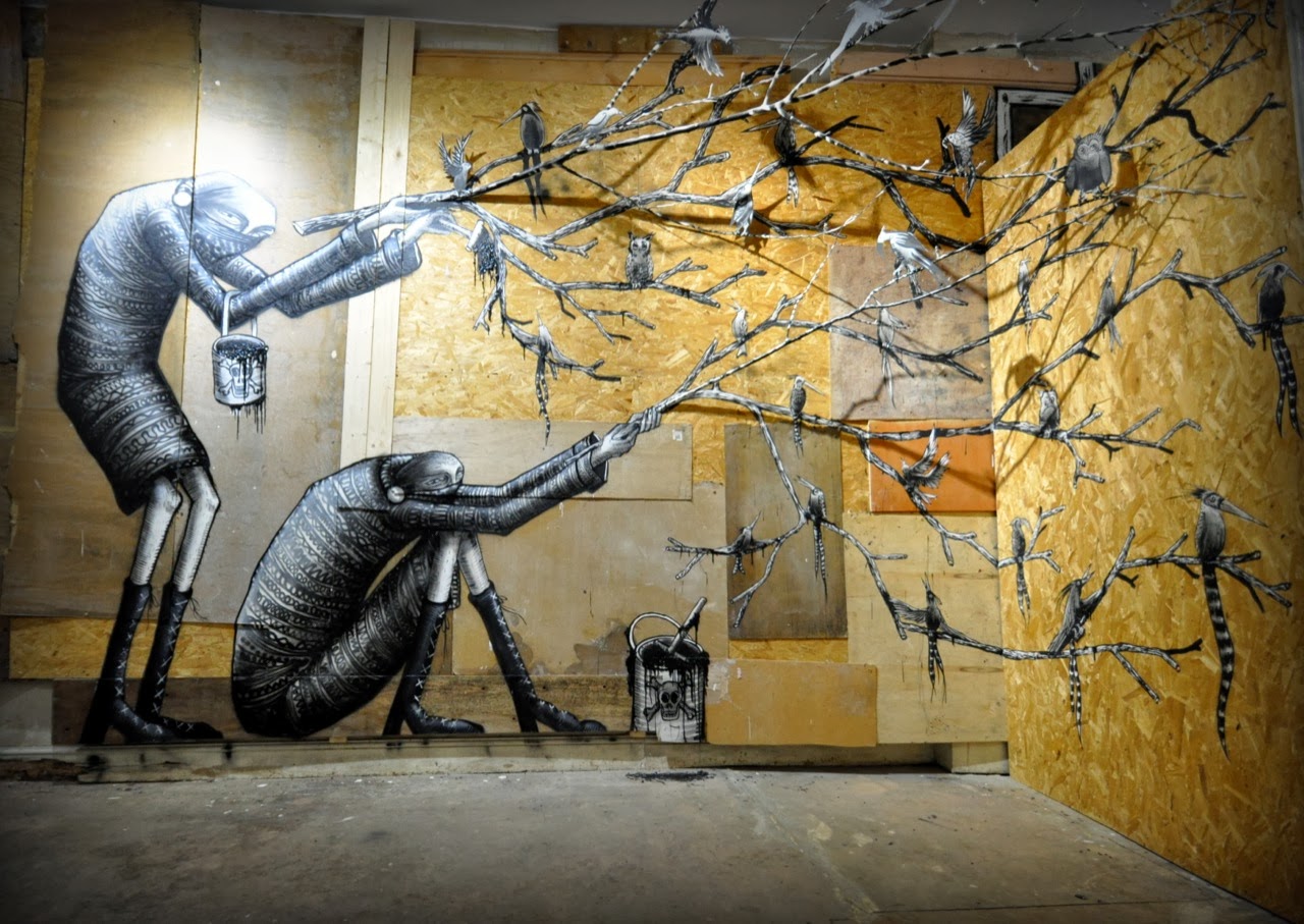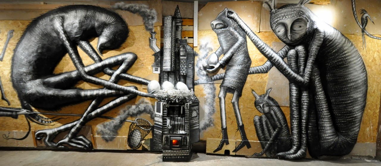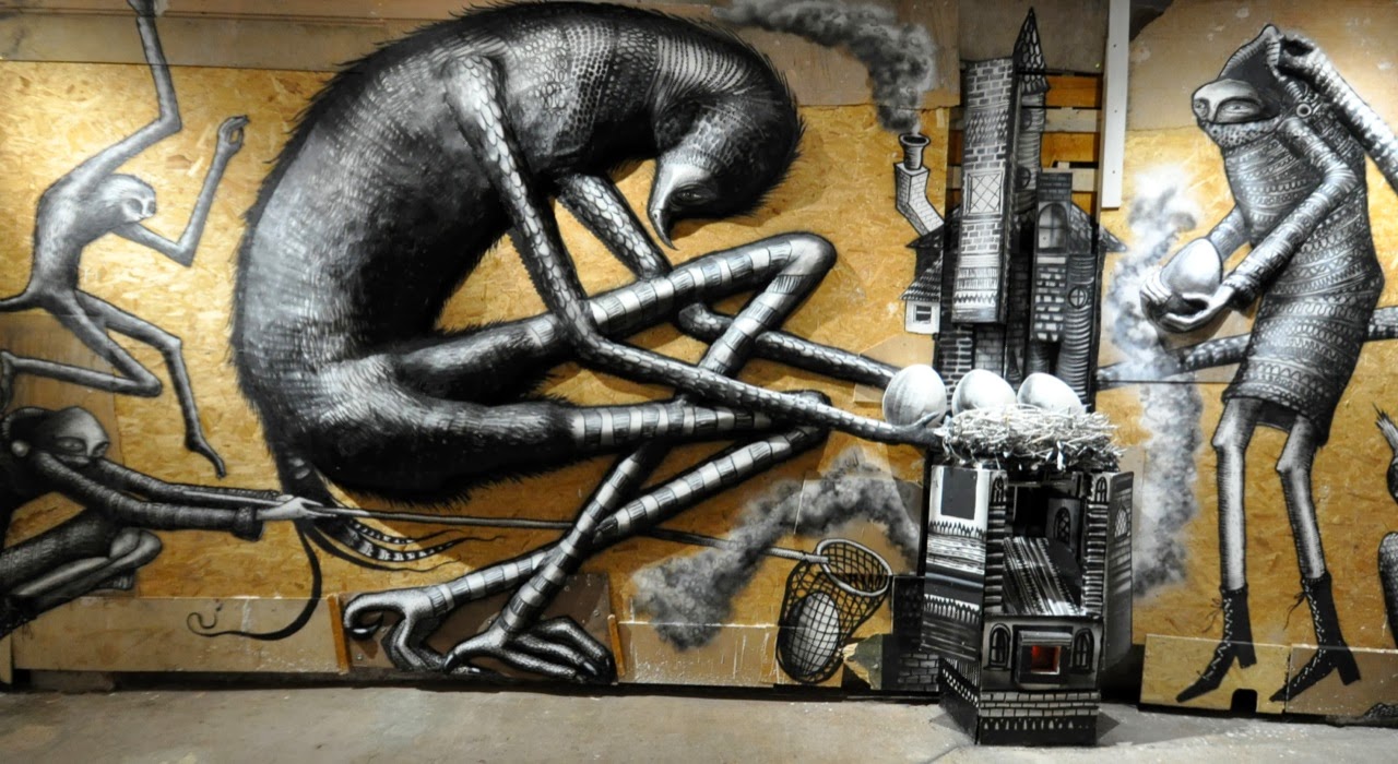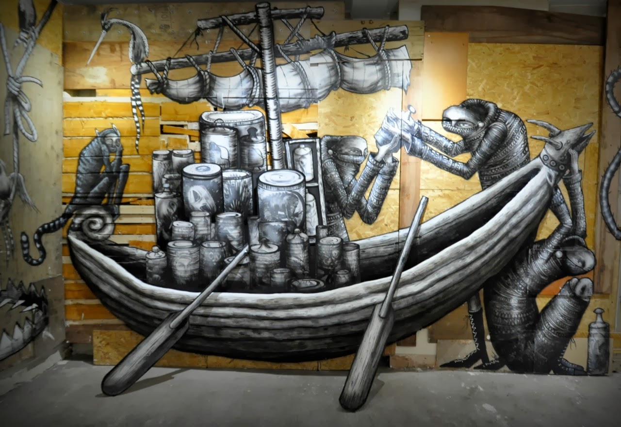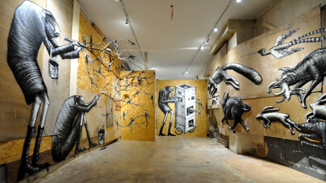 The show starts with a small maze showing a bunch of painted specimen jars containing animals and various nods to other artists like Banksy. The next part is a large room with a series of massive monochrome characters painted in plaster relief upon the walls.