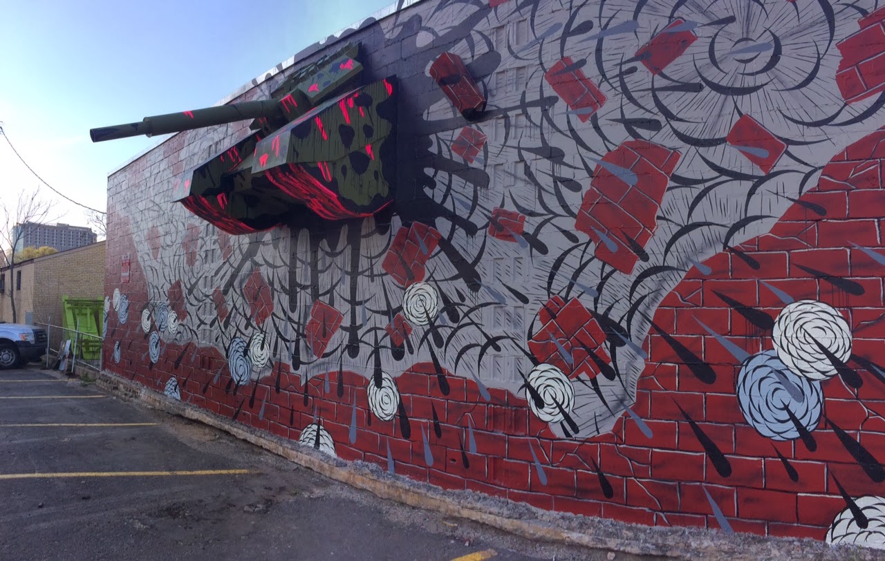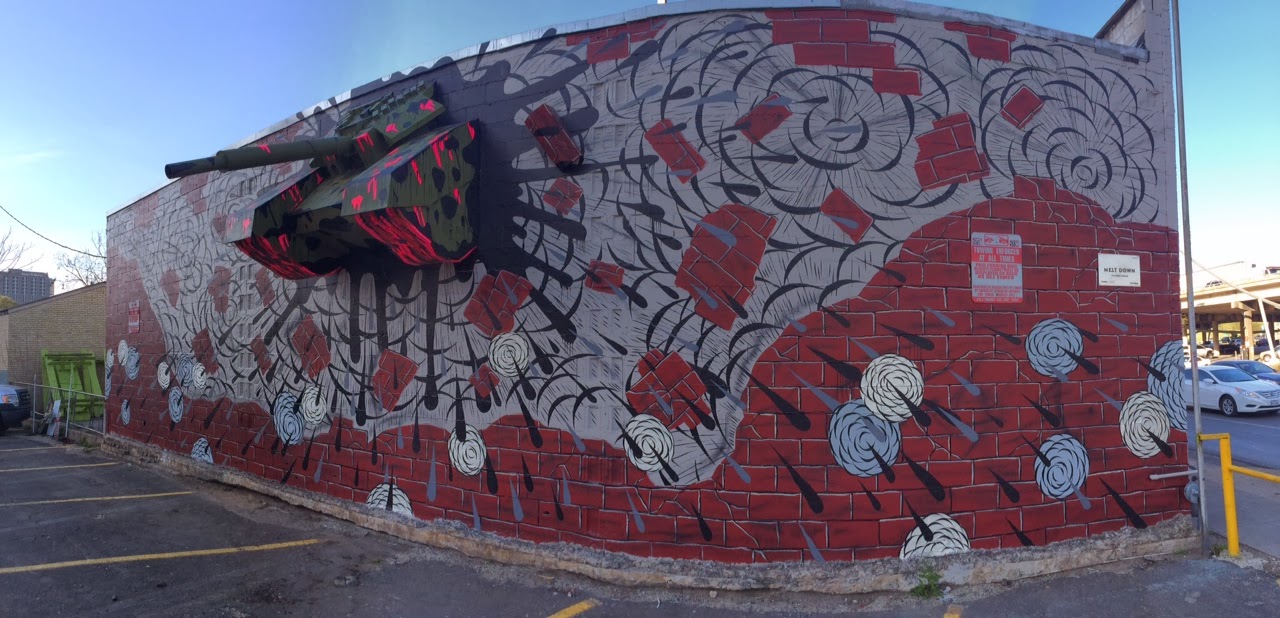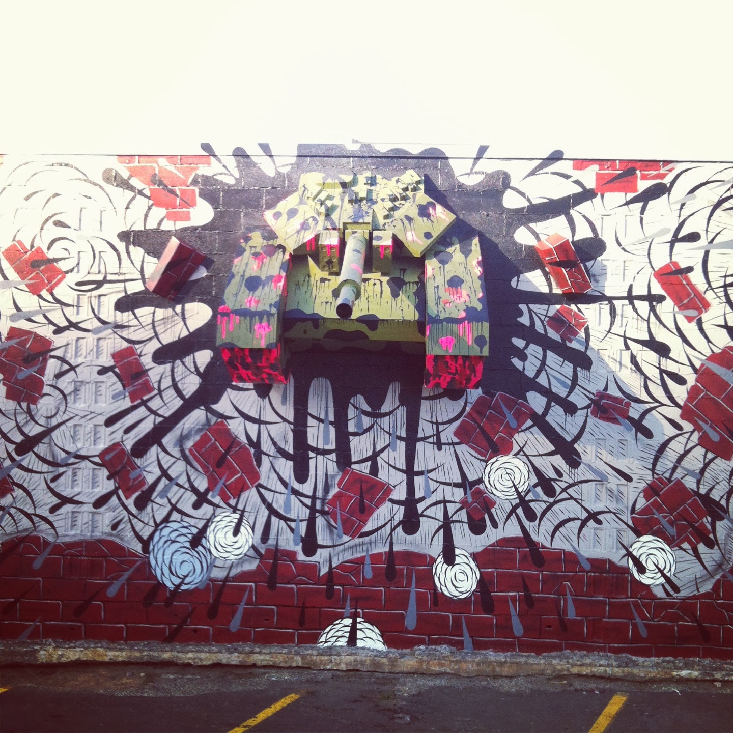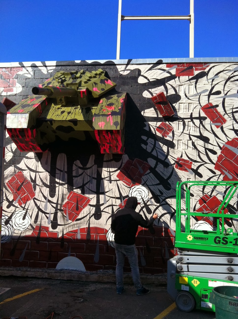 The talented American artist dropped this amazing piece / installation which is featuring a homemade tank incorporated into the wall. Stunning.