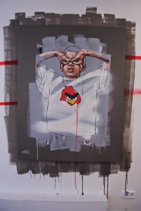 While you discovered Ernest Zacharevic‘s latest street pieces in Barcelona (covered), the young Lithuanian artists was finishing up painting, installing and setting up the new works for his solo show “Rock Paper Scissors!” @ Montana Gallery in Barcelona.