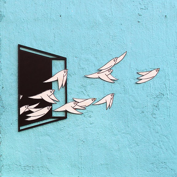 Know Hope’s simple illustrative style worked super well with Aakash clean geometrical elements, especially combined with the bright colored wall they picked. The result is this simple and very effective piece showing flock of birds flying inside and out of the wall.