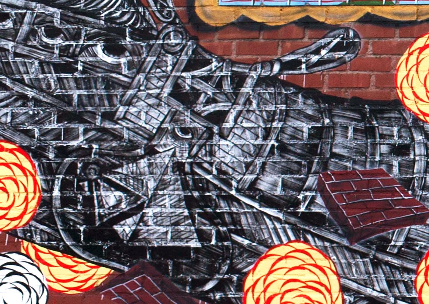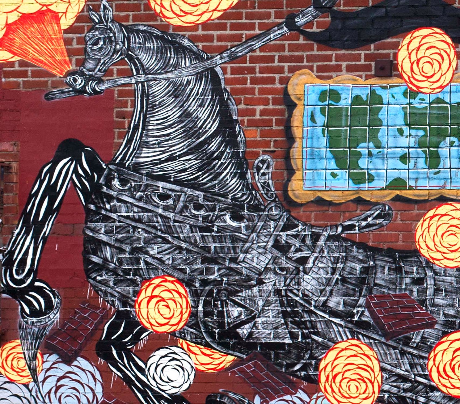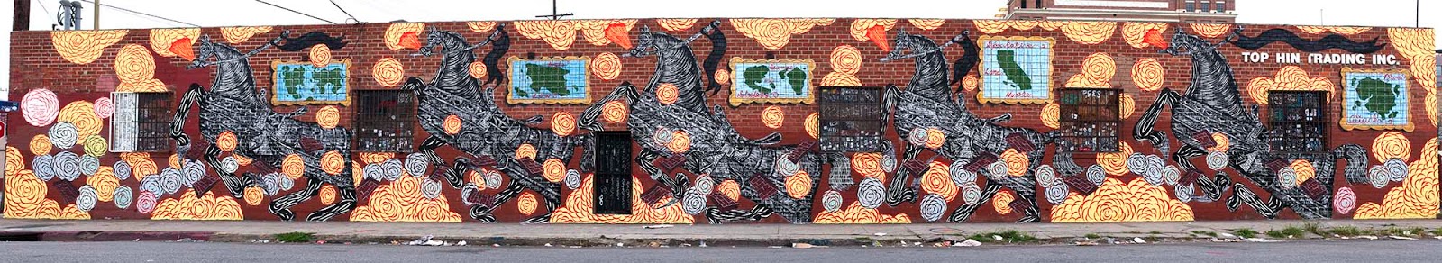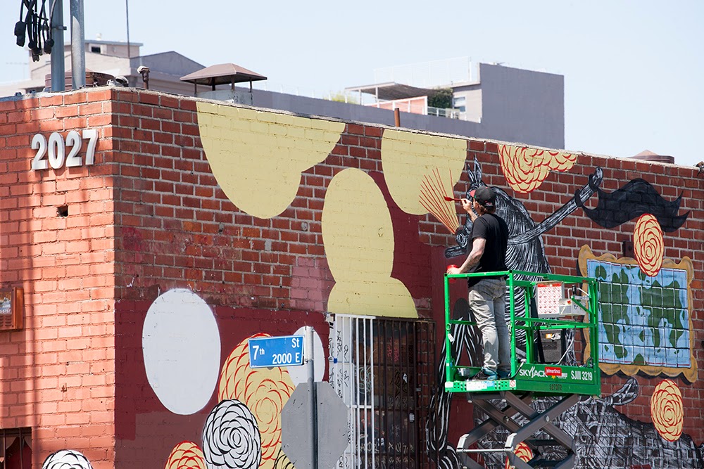 Andrew Schoultz spent the last few days working on this massive 26 feet by 160 feet monster mural on the streets of Los Angeles, USA.