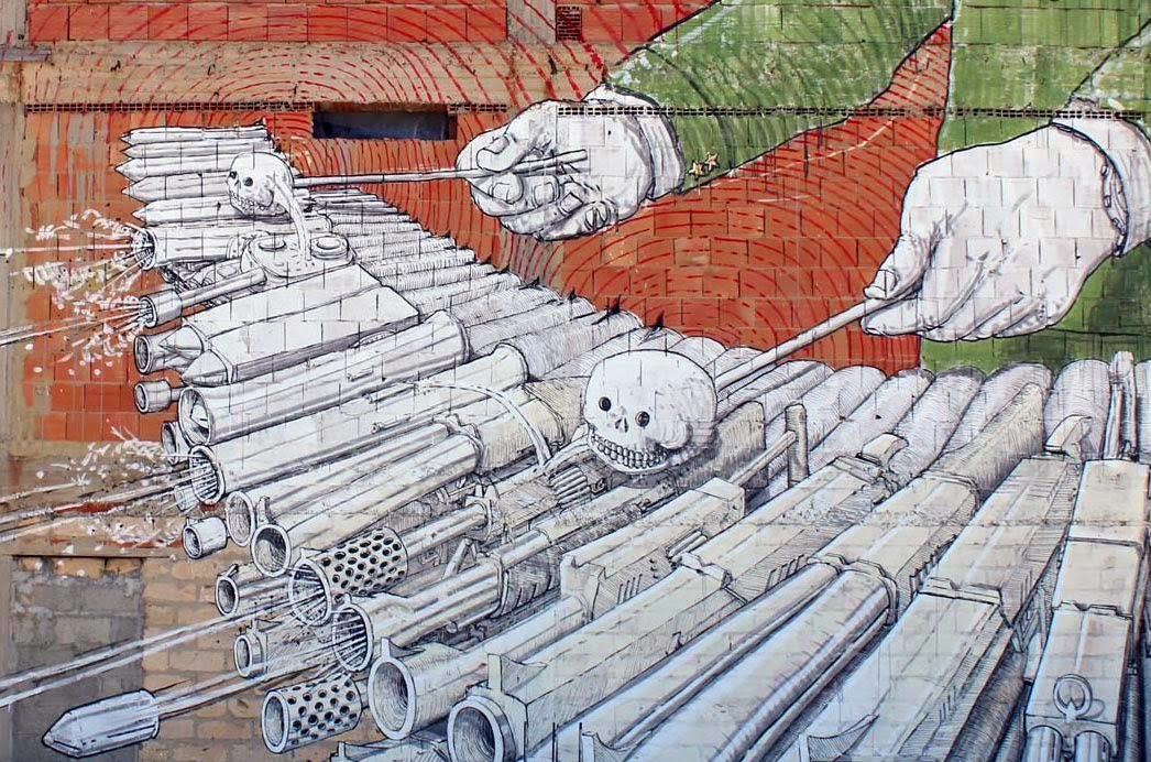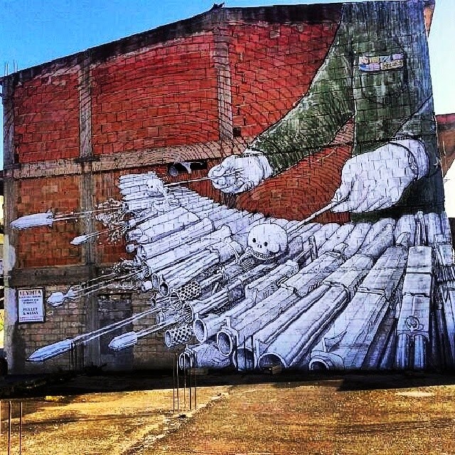 As usual with the Italian maestro, he brought some of his unique imagery for the locals to enjoy. This time around, Bly painted the vision of an Army General playing a kind of modified Xylophone which is shooting deadly bullets. Genius.