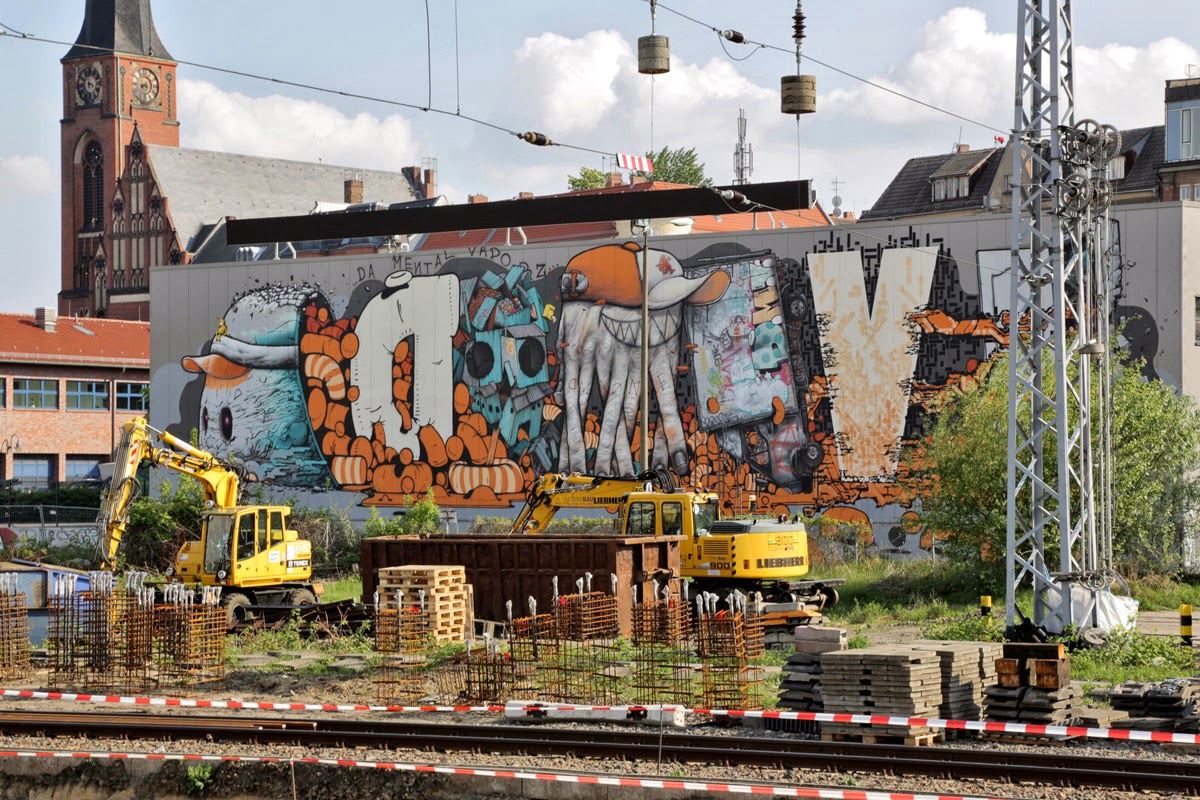 While you discovered some progress shots a few days ago (covered), the Da Mental Vaporz crew have now completed their gigantic 43 meters long mural in Berlin, Germany.