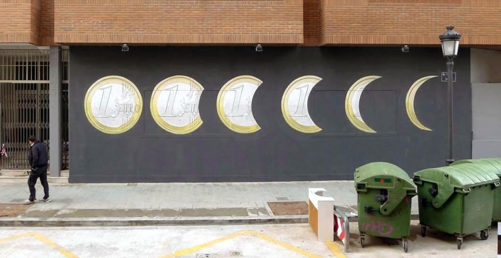 Entitled “Eclipse”, Escif painted a series of Euro coins slowly disappearing as with the effect of an Eclipse.