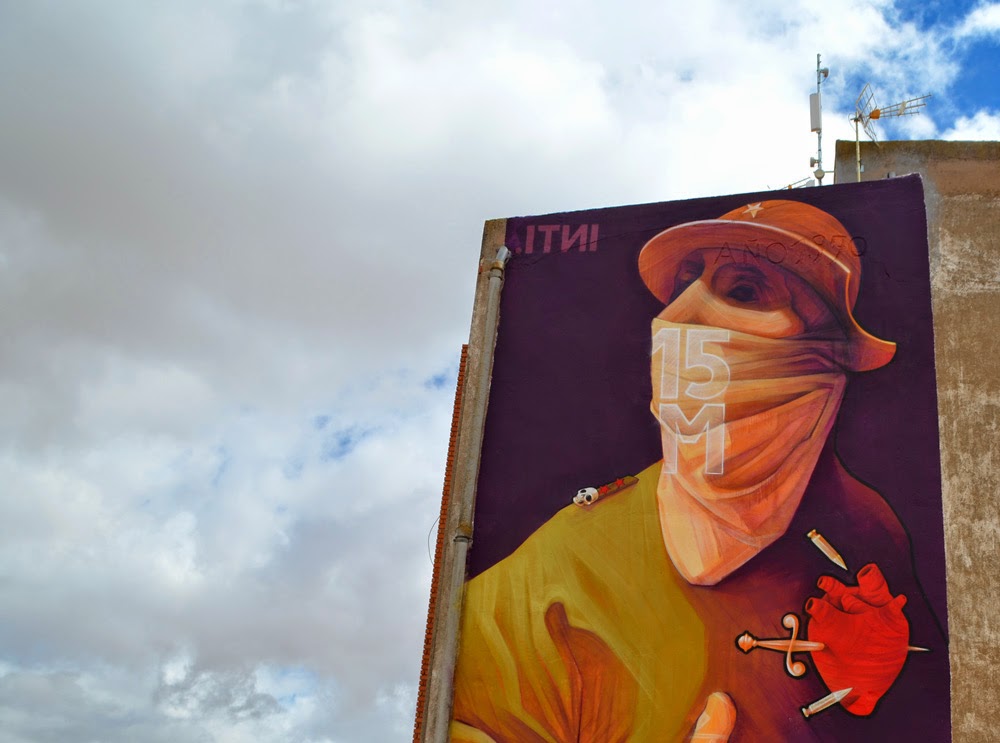 You’d probably like to know that INTI’s wallpainting has been quite controversial in the little town he’s painted. The major and concilors of the town hall, that is the agents of public institutions, got really angry and rejected the mural when INTI wrote the words 15M on the scarf of his Quixote. There was a lot of tension at the street in that moment. Even a councillor was really aggressive and almost hit one of the cameramen of the project. After a complicated negotiation, finally they accepted to cover the letters with some painting, because otherwise they told that the wall would be painted on white so the mural would be deleted forever. Now they’re not respecting this agreement and they still keep on the idea of erasing Inti’s artwork. Today the major appeared on TV and told that there’s terrorist simbology on the mural. They related it to the FARC guerrilla of Colombia and other violent collectives worldwide, but somehow they didn’t prove it. Indeed that’s not true. Now we’re still fighting in order to preserve this piece. Controversy is on the air… –Santiago González (Organiser)