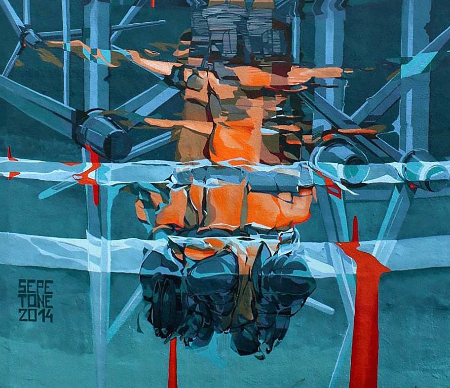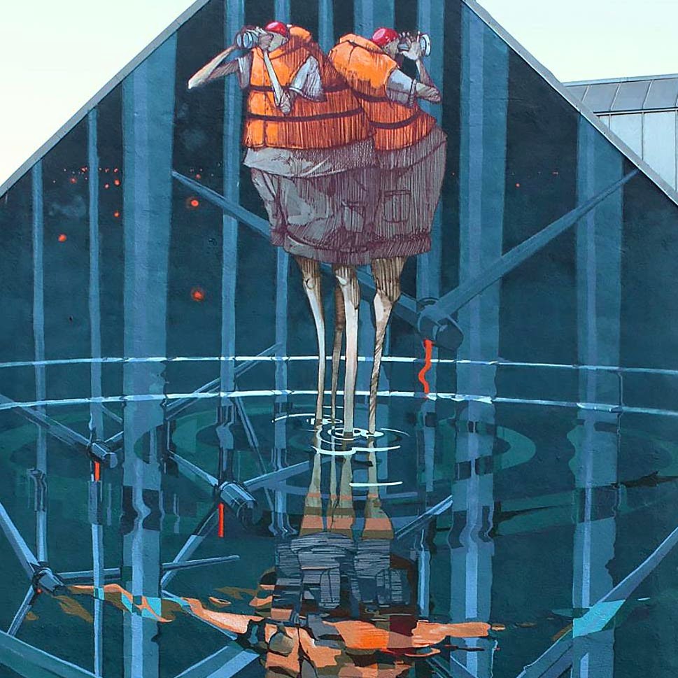 Invited by the Galleri KIRK, the Polish Street Art duo painted this stunning and beautiful Blue and Orange piece which is featuring each artist’s distinctive style and techniques. The wall is entitled “Mayday Mayday”