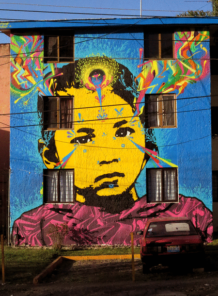 Stinkfish works are based off images that he has captured on the streets then overlayed with a multitude of vivid colours and patterns. This wall was organised by the Gallery Urbana Monumental.