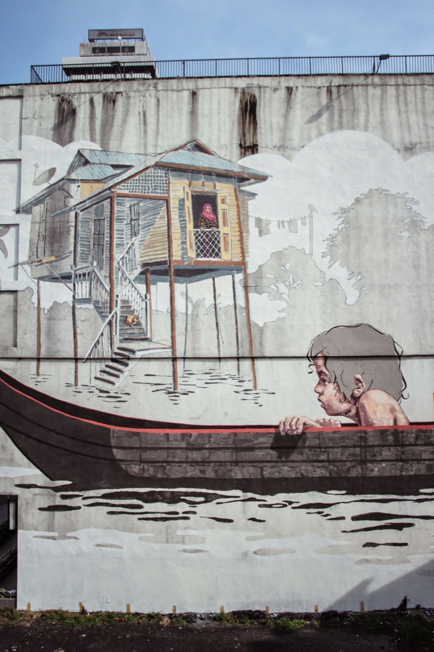 The prolific Lithuanian street artist painted this piece which shows a young boy riding a traditional pirogue.