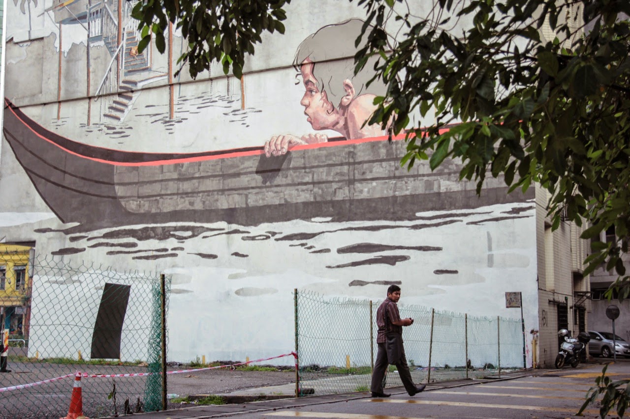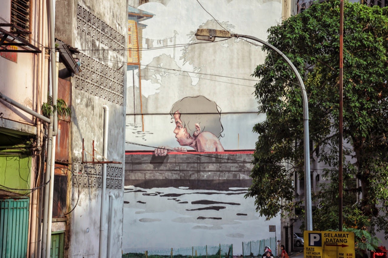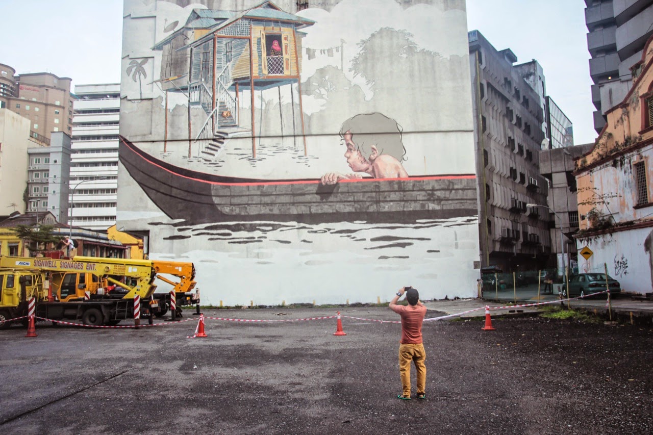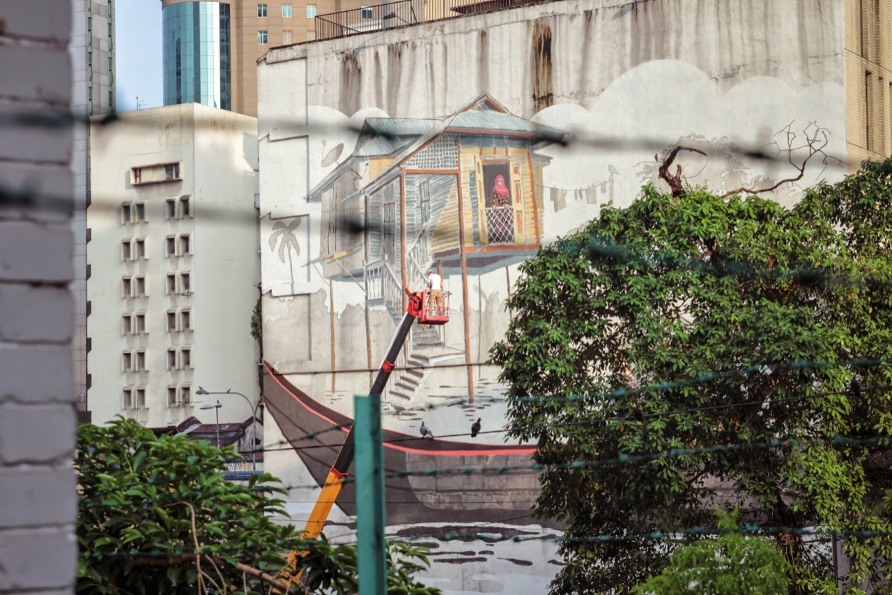 After an installation in Kuching last month (covered), Ernest Zacharevic is back in Kuala Lumpur where he worked a few days on this massive new piece.