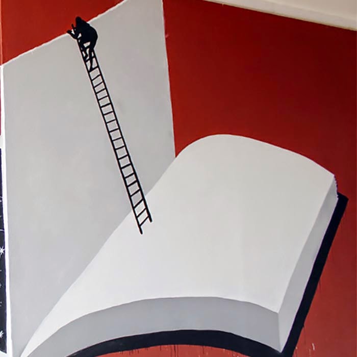 The Murcia-based artist painted this piece which is showing a black silhouette climbing up the blank page of a book to discover the galaxy which is hidden behind.