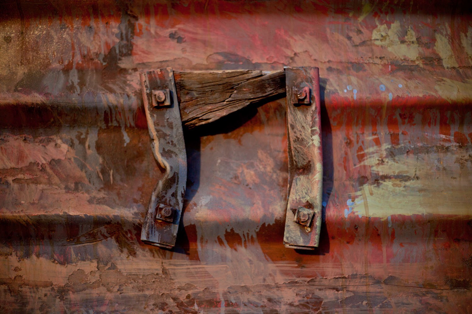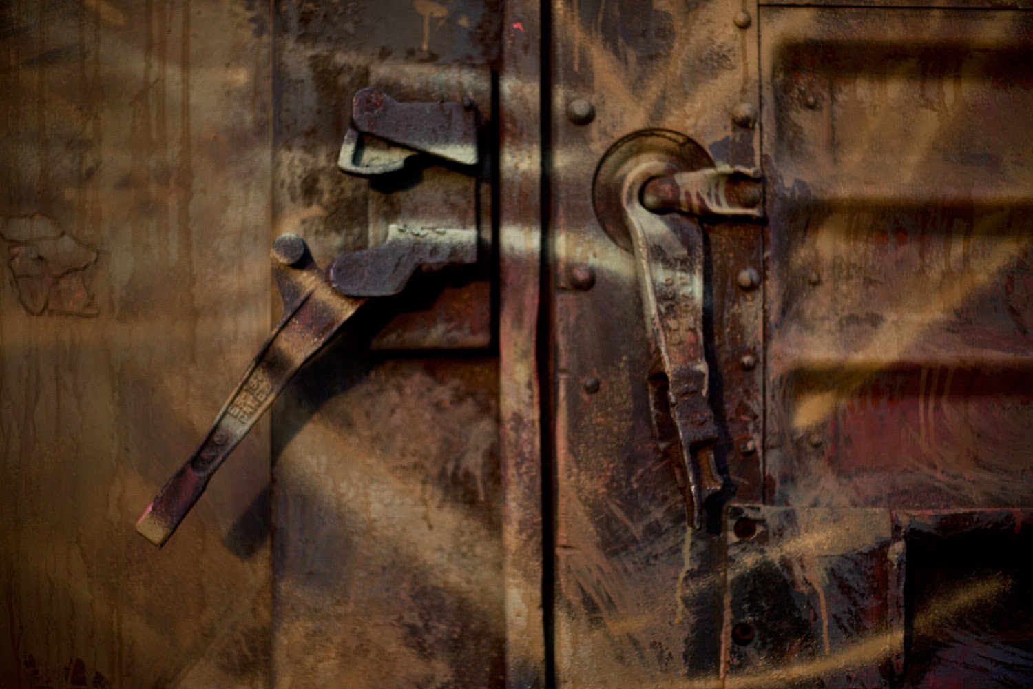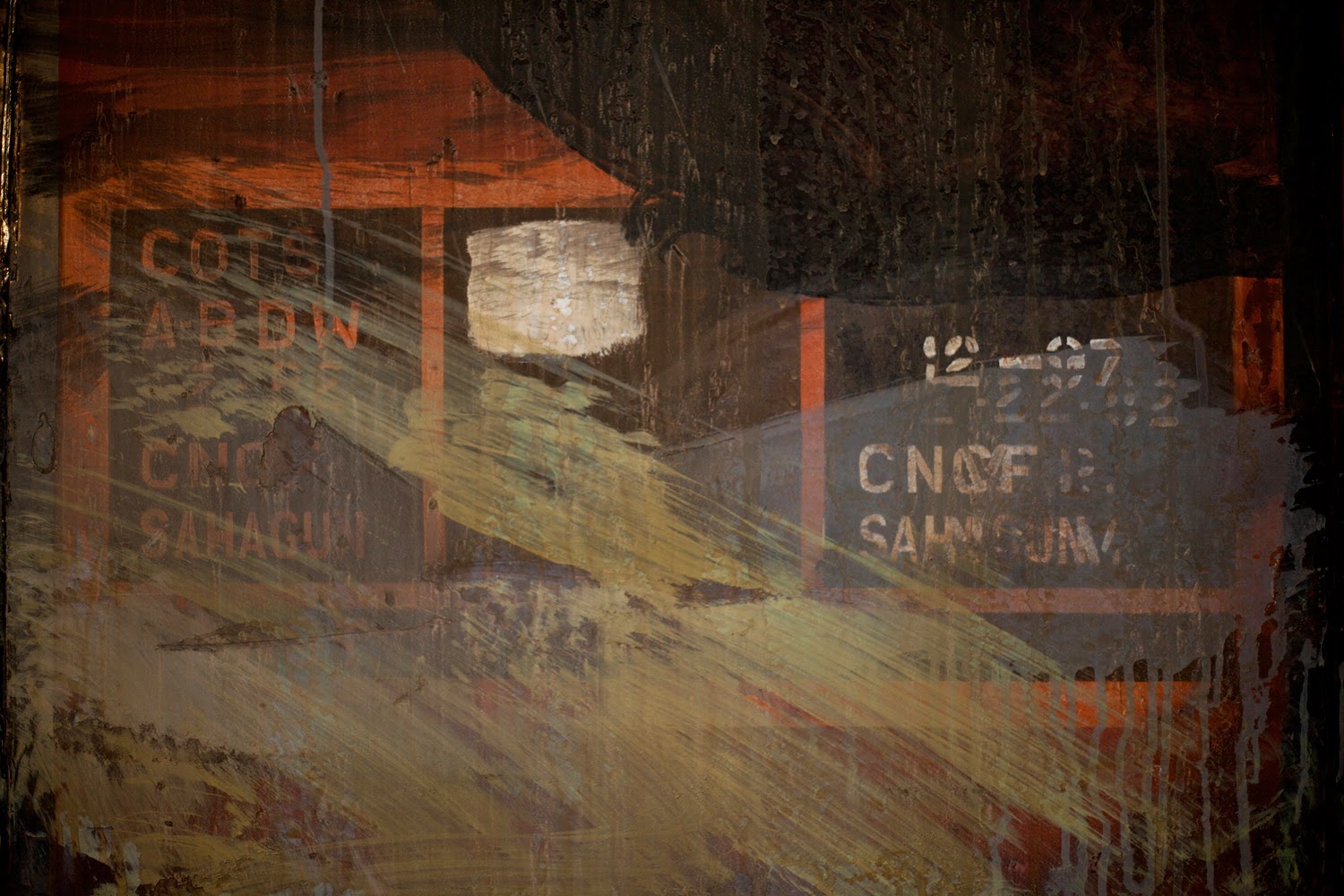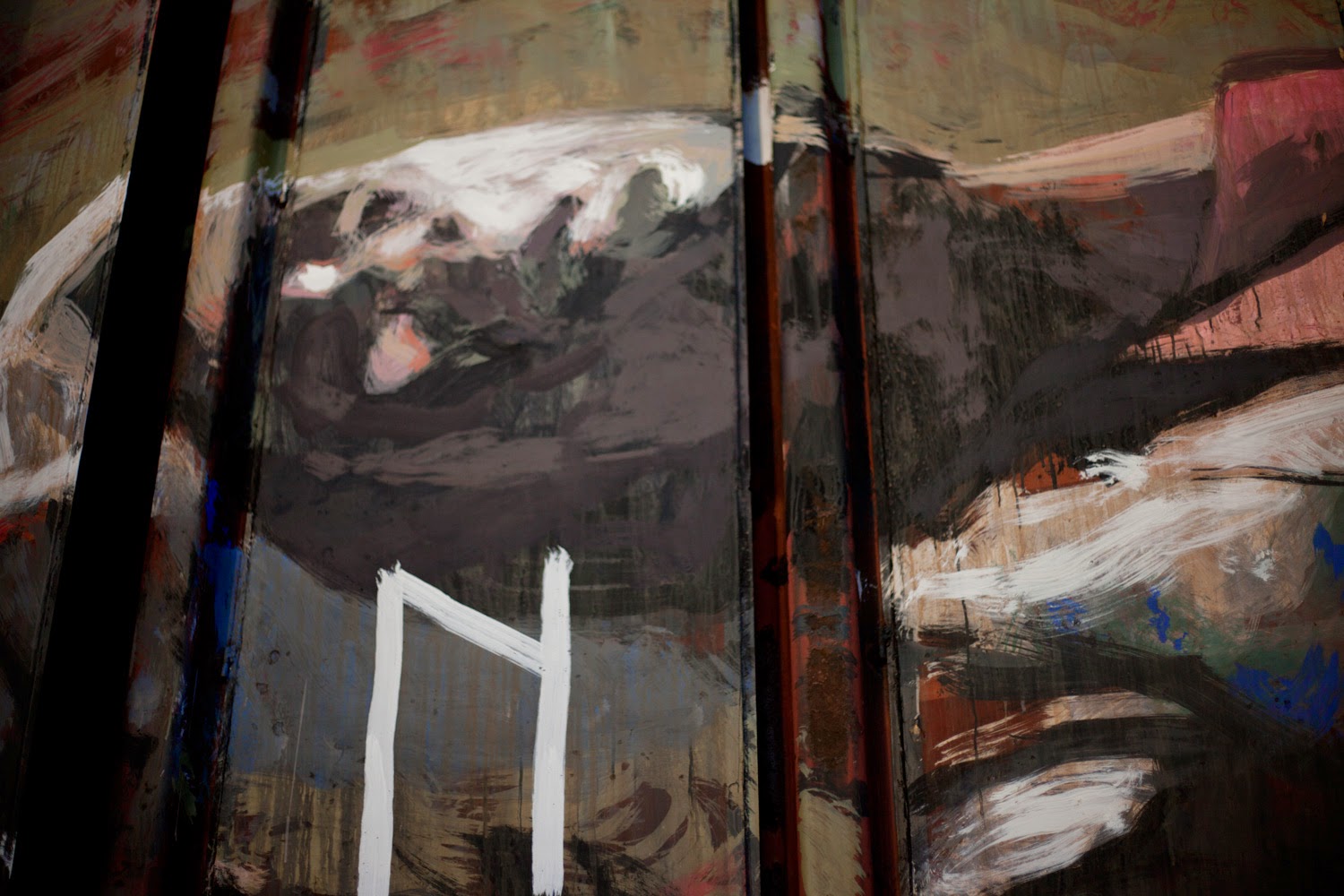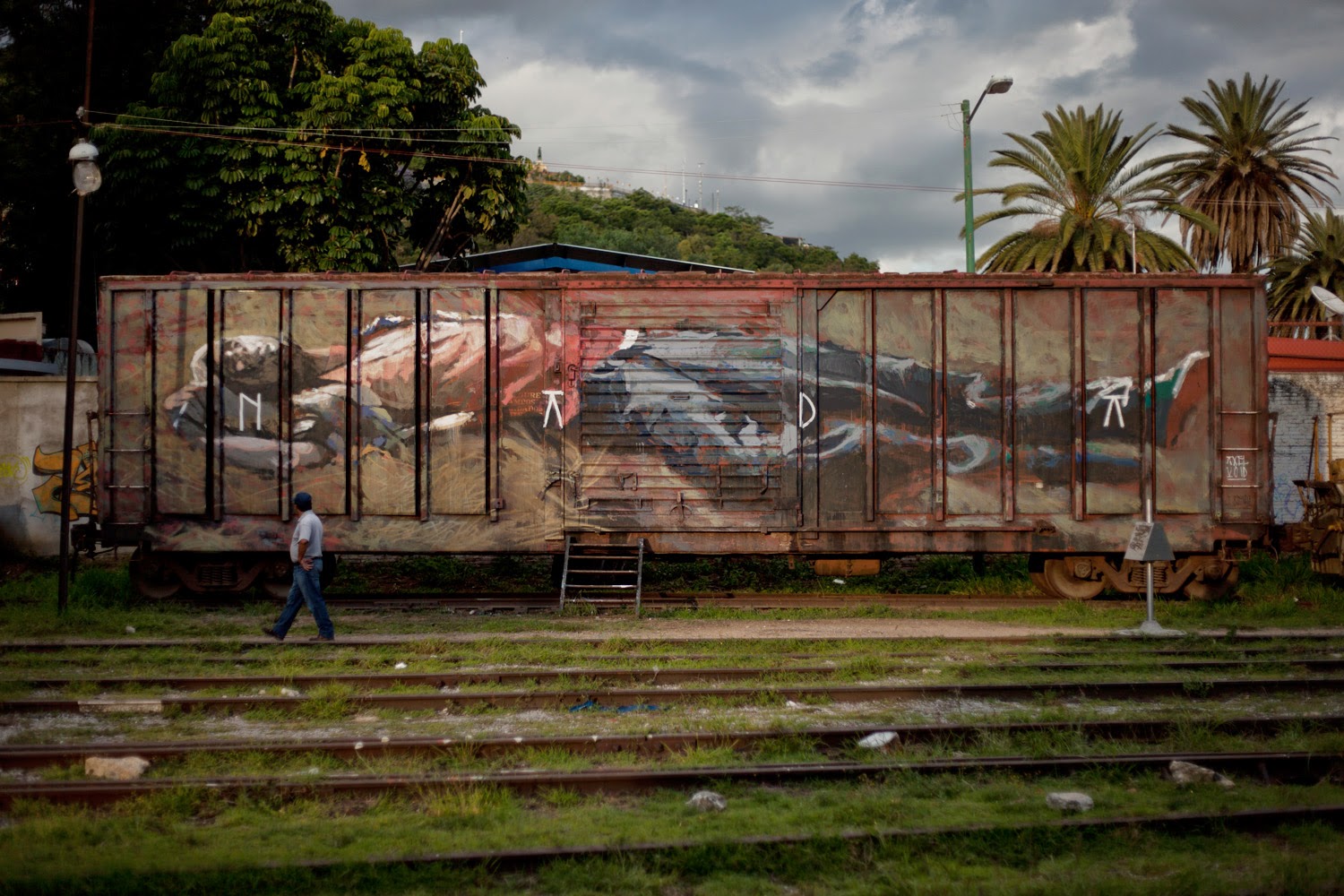The painting was taken from an image of an immigrant that was assaulted when travelling on “La Bestia” (The Beast). This is the name for several cargo trains that immigrants use to cross from the south to the north of México, with the intention of crossing the border to the United States. Its possible that this same wagon from the N de M Company was part of “La Bestia”.